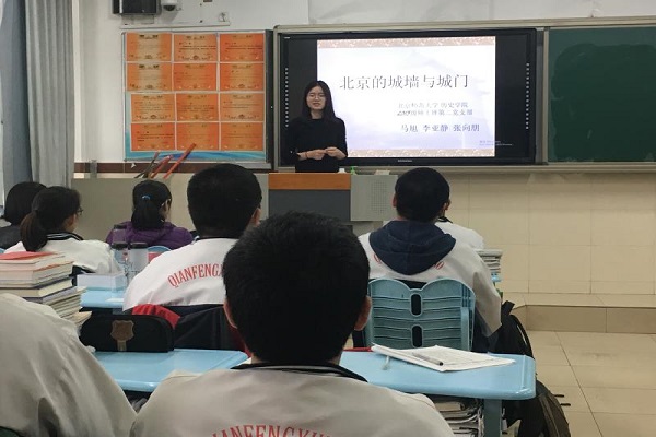 2015级博士生支部张泓林、刘惠、高智敏为高二文科三班、四班授课。主讲人张泓林围绕“中国古代的衣与裳”这一主题,大致梳理了从先秦至清朝,我国衣裳制度是如何从确立到完善的。其中,重点介绍了汉服的服装特点和其文化内涵。2015级硕士生第一党支部马旭、李亚静、张向鹏为高二理科五班、六班授课,主讲的马旭同学从大家熟悉的北京地铁二号线上有趣的站名引出话题,首先用动态的地图向同学们演示了历代北京城城址的空间变化,接下来重点分析明清北京城的布局特点,以及各个城门的历史文化与功能和城门的故事折射出来的北京城独特的文化韵味。2015级硕士生第二党支部刘东庆、贾彩绫、张赫靓为高二文科一班、二班授课。主讲的刘东庆同学围绕“新文化运动”,由五四大街、北大红楼这些景点入手引入课堂的主题,从袁世凯的几张照片导入新文化运动发生的国内外背景,以胡适、陈独秀等人的活动作为主线,穿插新文化时期重要的人物的言论主张,向学生展示了更加丰富、多个面相的运动过程。课堂最后从“打倒孔家店”的口号反思如何处理传统文化与新文化的关系。同学们积极配合三位老师,课堂氛围活跃,师生互动频繁。