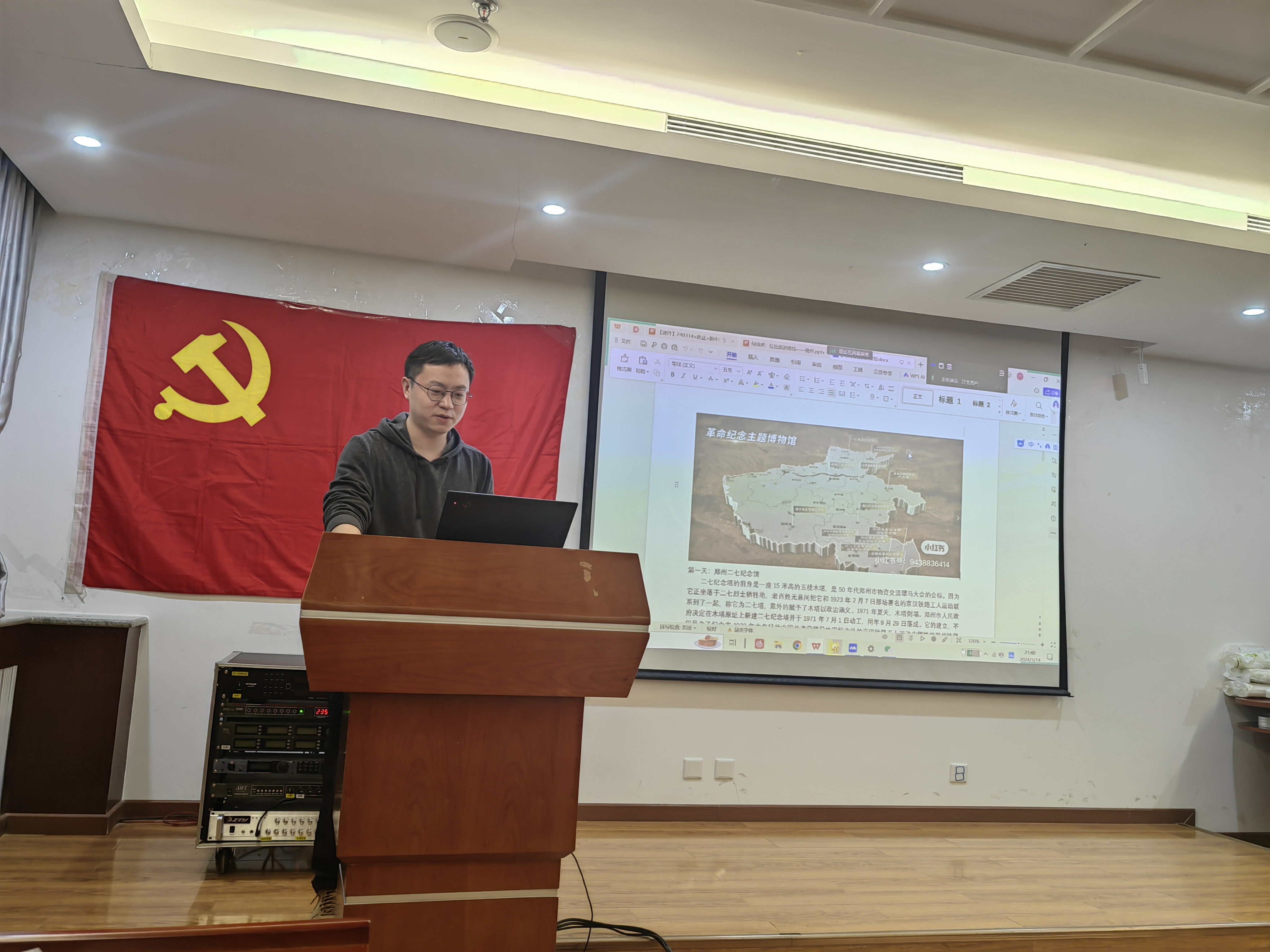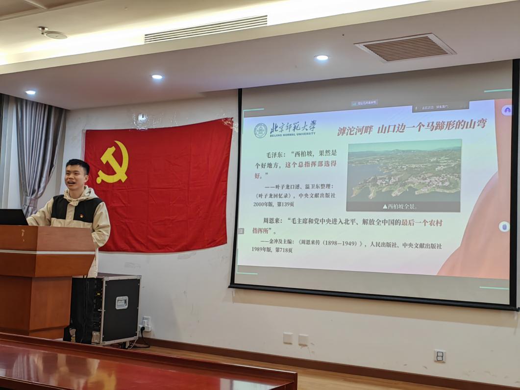 联学会邀请了来自求索学社的陈正同学,为与会党员带来了一场生动、深刻的宣讲——《新中共国从这里走来——西柏坡精神为何历久弥新》,从西柏坡农村指挥所讲起,到人民至上的精神、艰苦奋斗的优良作风,带领我们共同回顾了中国共产党的奋斗史,以及革命先辈们在实践中展现的优量精神作风的发展史,令与会党员们感慨颇深,也提示我们青年一辈要接续接力,赓续传承先辈们艰苦卓绝、奋斗向前的精神作风,跑出属于我们这一代人的新成绩。