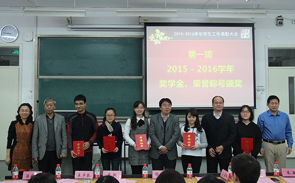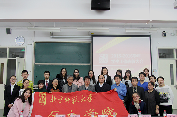 大会首先由姜海军老师宣读2015-2016学年本科生国家奖学金、国家励志奖学金、京师奖学金、专项奖学金、社会奖学金以及三好学生等荣誉称号获得者名单;李帆老师宣读2015-2016学年研究生国家奖学金、学业奖学金、专项奖学金、社会奖学金等荣誉称号获得者名单。随后进行大会第二项,郭家宏老师宣读白寿彝史学论著奖本科生组获奖名单。大会第三项流程是2016年度学生工作颁奖,在播放必威betway西汉姆联2015-2016学年学生工作回顾展示视频后,王卓凯老师宣读了各项国家级、市级及校院两级学生工作教师、集体类奖项获奖名单;湛晓白老师和朱敏老师分别宣读了校级和学院学生工作获奖学生名单。院长杨共乐老师、副院长李帆老师、副院长姜海军老师、分党委副书记王卓凯老师、世界近代史教研室主任郭家宏老师为获奖代表颁奖,并与获奖代表合影留念。