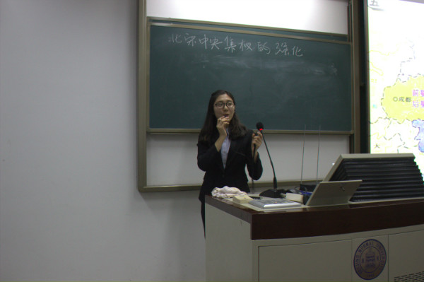 第一位选手王昱婷以“从辫子问题看辛亥革命的影响”为课题,一开始就从电视剧图片展开,在教案中选取了丰富的材料,使得课堂内容十分充实。第二位选手全妙在讲解“两级对峙格局的形成”时引用了经典图片“和平之吻”,从战争结束后世界人民对和平的渴望为切入点讲述了两极格局形成背景。第三位选手马超别出心裁,讲授了“以澳大利亚为例分析气候问题”的地理内容。在评委提问环节中,马超同学分析了地理学科与历史学科之间的区别和联系,新颖的观点令人印象深刻。第四位选手马海玉的课题为“北宋中央集权”,采用较多图片,重视与台下互动,使得课堂完整性强,十分生动有感染力。第五位选手马桐桦在讲授“新航路的开辟”的一开始就列出学习目标,教学内容紧凑,节奏较快。第六位选手耿佳丽选择“新文化运动”中运动开展对文学艺术方面的影响进行讲述,切入点细微但展开内容十分丰富。第七位选手郑伊楠讲授的是“新航路的开辟”拓展课题。一开始,游戏“大航海时代”就吸引了所有人注意力。接下来郑伊楠就游戏介绍模拟了历史情景,比较郑和下西洋与哥伦布航海两个时间的背景和影响。在评委提问环节中,郑伊楠认为8分钟的课堂设计是对某一问题的深入探讨,所要追求的深度而不是广度;而其课堂内涵是通过一个拓展知识点引领学生思考西方新航路的开辟对促进资本主义发展的意义。评委对郑伊楠做出了“剑走偏锋、力求新意”的好评。第八位选手独力讲解了“科举制的意义”,先是整理出科举制发展的脉络,随后就其历史意义展开讲述。独力的课件制作简洁明了,思路清晰。