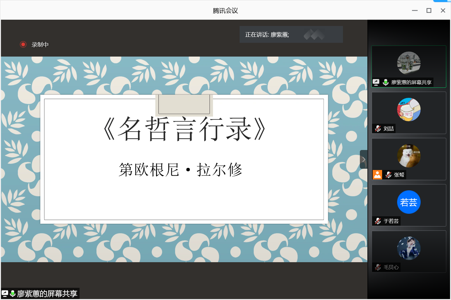 廖紫蕙同学重点介绍了本学期将要阅读的重点书籍《名哲言行录》,简要梳理了书中所涉及到的学派。她指出,第欧根尼·拉尔修所著的《名哲言行录》主要按照学派发展来行文,且其转述性和引用性强,没有自身的哲学立场,因而其有较高的可信度和哲学价值。但鉴于其偏重文字描述而不是思想描述,如果大家想要深入了解各个学派,她建议同学们去自主阅读各学派的专门著作。