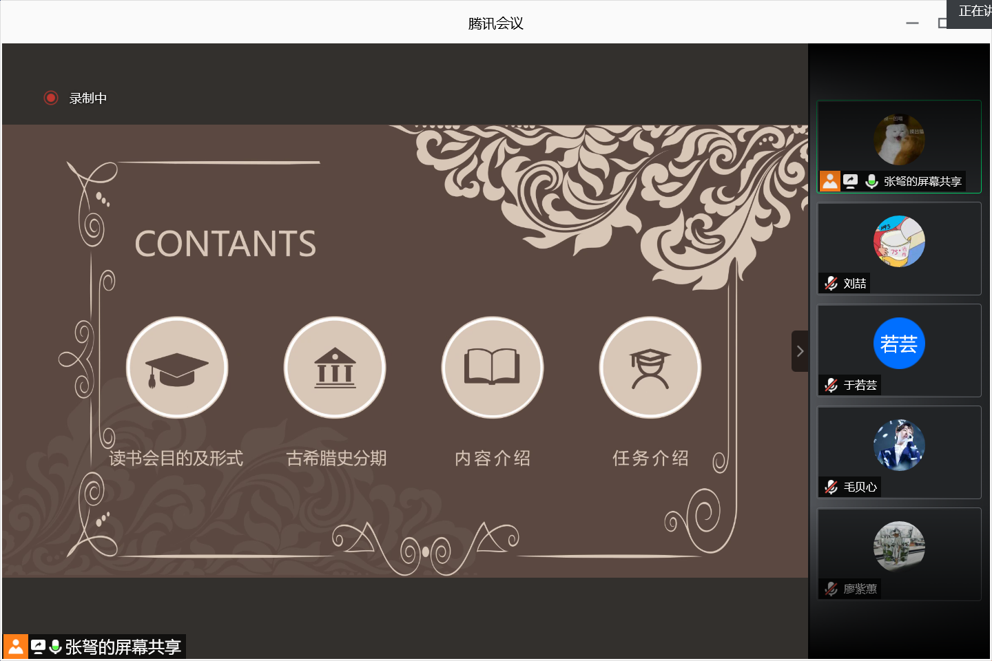 首先,张弩同学向大家介绍了读书会的目的及形式,本学期的读书会将采用阅读、讨论然后训练的形式,帮助同学们了解世界古代史的相关内容。他特别指出阅读文本在古代史学习中的重要性,建议同学们尽量从英文译本入手。紧接着,他带领同学们简单梳理了古希腊史的分期,简要介绍了五位亚历山大史家和他们的著作,重点介绍了同学们将要阅读的《亚历山大远征记》及读书会所选用的版本。
