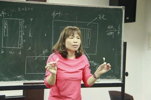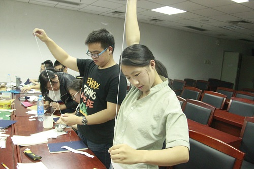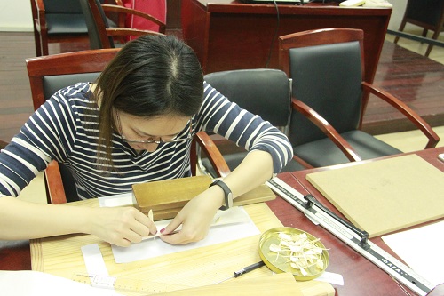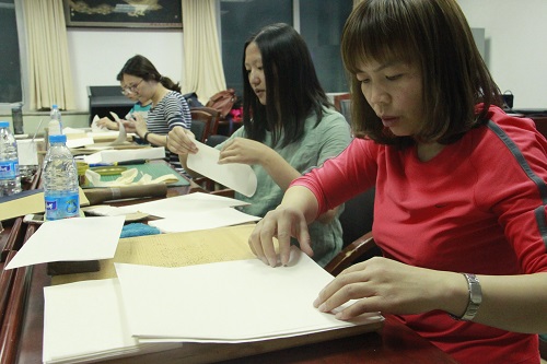 首先,在两位老师的指导下,同学们认真折页,开始制作线装书的第一步。接着,两位老师对线装书制作的流程做了大致介绍,指出制作线装书主要有十个流程,分别是:刷版、折页、齐栏、压平、订捻、裁切、上皮、打眼、缝线与贴签,并对订捻、打眼及缝线的方法做了详细的解释与示范。