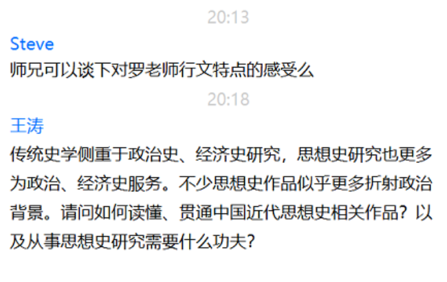 分享结束后,陈兴同学还就同学们提出的有关罗志田先生的行文特点和中国思想史研究的相关思考等问题进行了回答。