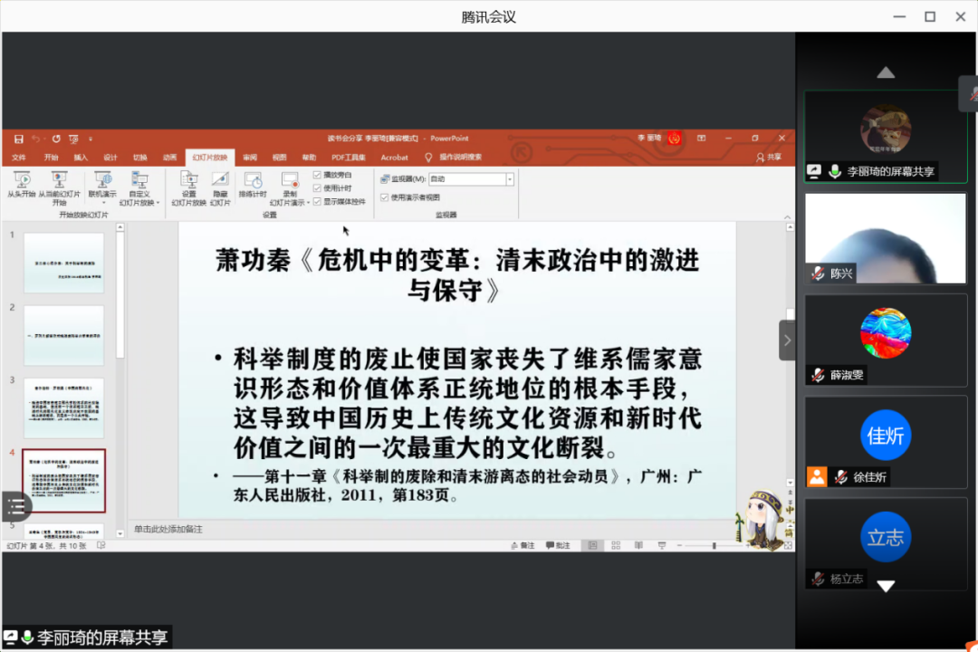 4月11日晚七点,春秋学社线上举办了《权势转移:近代中国的思想与社会》(以下简称《权势转移》)第一次线上主题分享会。本次分享会有幸邀请到中国人民大学必威betway西汉姆联硕士,必威betway西汉姆联2016届本科生陈兴作为点评嘉宾。分享会由企划部李佳宁主持。