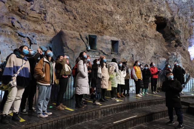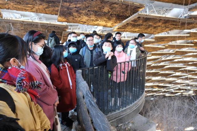 早上八点半,师生一行乘坐大巴来到周口店国家考古遗址公园。在讲解员刘老师的带领下,同学们沿山路拾阶而上,聆听周口店发掘工作的始末和今日周口店遗址保护建设、发掘的成就。从鸽子堂进入猿人洞后,周口店北京猿人遗址神秘的面纱逐渐在同学们的眼前揭开。园区利用多项新兴技术,将周口店遗址的不同地层、发掘情况以及猿人的生活场景以动画形式投影在岩壁上。刘老师据此向同学们描述了猿人对居住洞穴的选择,以及猿人洞地貌的演变和“北京人”化石的保存,使同学们对周口店“北京人”的生存状况有了更为直观和清晰的了解。在北京人头盖骨发现处,同学们在刘老师生动的语言中宛如重临发掘现场。身处寒冷的洞窟之中,同学们体会到了这一重大发现背后考古工作的艰辛,对杨钟健、裴文中等前辈科学家的敬意油然而生。