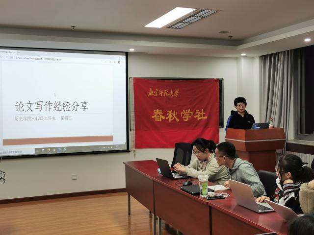 分享会开始后,翟明杰同学首先介绍了自己大学期间的学术写作经历以及所获奖项。接着,他根据自己的写作经验提出了一些建议,包括尽早确定研究方向、积极参加各类论文评选活动、合理安排写作时间等等。他还鼓励大一大二的同学们多尝试,多历练,对于自己感兴趣的课程论文多花心思,为以后的论文完善奠定基础。然后,他介绍了论文写作的一般流程,指出在写作前需要做大量的前期准备工作,包括专著阅读、确定研究问题、有选择性地检读史料、酝酿多个题目、检索研究成果和选定题目多个环节。在讲述研究问题时,他推荐了一些书籍和刊物来帮助同学们追踪研究热点。