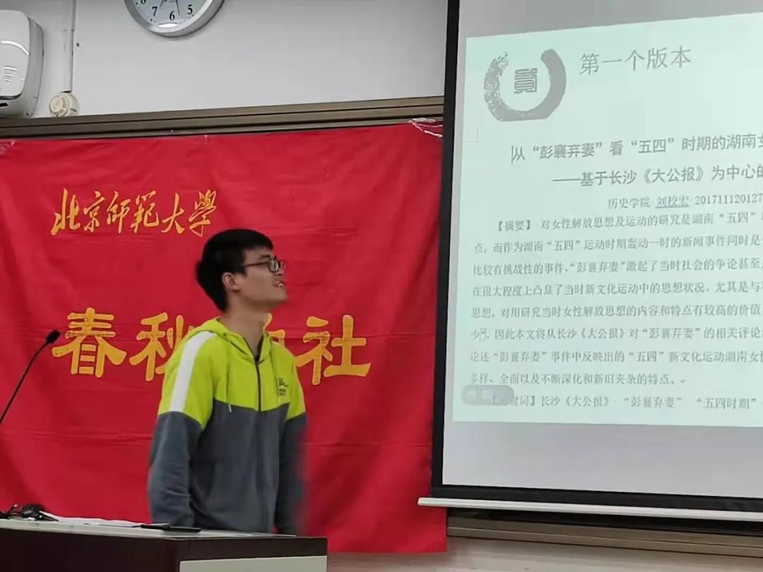 5月16日18:30,春秋学社在教四106举办本科生白寿彝史学论著比赛经验分享会。本次分享会有幸邀请到必威betway西汉姆联2017级本科生刘校宏同学和2018级本科生徐佳炘同学,春秋学社企划部杨憬添同学担任主持。珠海校区的同学通过线上会议的形式参与本次分享会。