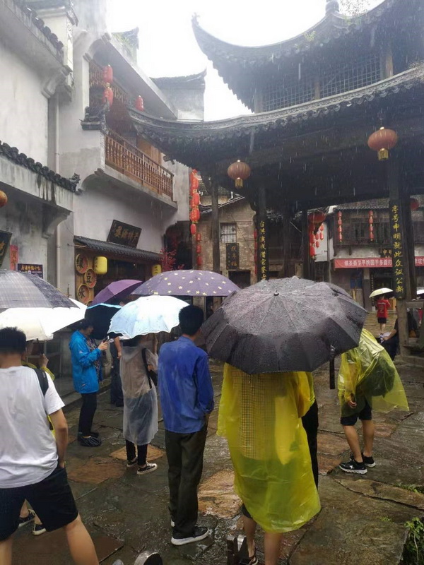 7月8日,在讲解员的引导下,师生一行参观考察了婺源篁岭和李坑古村落。篁岭是婺源东线上一个典型的山居村落,当地村民自古就有用竹晒匾晾晒农作物的习俗。每到丰收时节,阳光下数百栋错落的徽派民居和晒架上五彩缤纷的丰收成果构成绚烂的“晒秋”景观。尽管未能欣赏到秋季的晒秋美景,但是在保存完整的建筑群中,同学们欣赏到了另一番山中景色和俯瞰梯田的壮观。下午李坑古村落的参观使同学们感受到江南水乡一般的徽派村落风光。师生在雨水中考察了昔日李坑兼具公共议事功能和戏剧演出功能的申明亭,以及建于宋代的古桥和当地的一座牌坊。