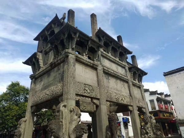 7月3日,师生一行乘坐高铁前往歙县,先后参观了鲍家花园、棠樾牌坊群和徽州古城。鲍家花园原为清代乾隆、嘉庆年间著名徽商鲍启运的私家花园,是典型的古徽派园林与徽派盆景相结合的中国私家园林精品。而棠樾牌坊群则是鲍家这样一个徽商家族在400多年时间里竖起的家族丰碑,七座牌坊按照“忠孝节义结孝忠”排列,牌坊群旁边有三座祠堂,鲍氏支祠位于正中间,里面墙上的“忠孝廉节”由朱熹题写,两侧分别是世孝祠和安放女子排位的清懿堂,“清懿堂”三字由曾国藩题写,有“清白贞烈,德行美好”的寓意。下午,在讲解员的引导下,同学们参观了古徽州府的所在地徽州古城。古城内矗立着全国唯一的一座八角牌坊——许国石坊,还有后期修复的徽州府衙和保存完整的古徽州民居。民居内展示着古代徽州的闺房布置和堂屋的精致陈设。同学们为白墙黑瓦、青砖铺地的徽派建筑所吸引。