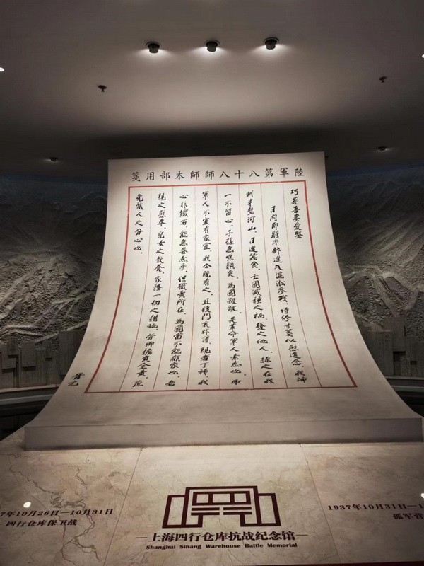 接下来,我们前往位于静安区光复路的四行仓库抗战纪念馆。纪念馆包括序厅、“血鏖淞沪”“坚守四行”“孤军抗争”“不朽丰碑”及尾厅等六个部分,以国民革命军陆军第八十八师五二四团团长谢晋元在奔赴淞沪战场前给妻子写下的家信为开端,在一到三层多处还原关键场景,陈列真实比例的英雄雕像,让师生们身临其境,仿佛真切感受到了战火的硝烟。驻足馆内,师生们无不为战士们顽强不屈、毁家纾难、抵御外侮的爱国主义精神而感动。对于我们而言,这是一堂生动无比的爱国主义课程。回首四行仓库旧址,弹痕犹在,英魂不朽,我们深刻意识到:应铭记历史,珍惜和平。