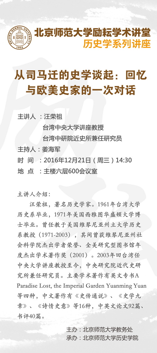 【励耘讲堂】汪荣祖:从司马迁的史学谈起:回忆与欧美史家的一次对话