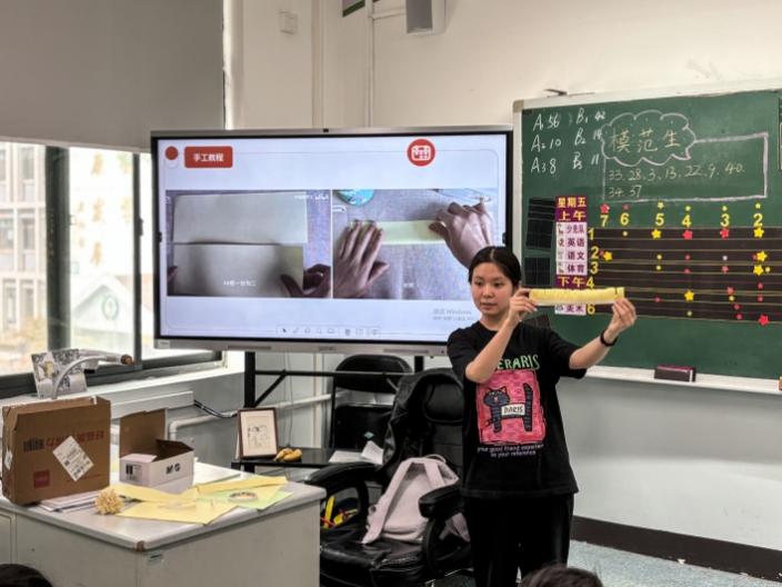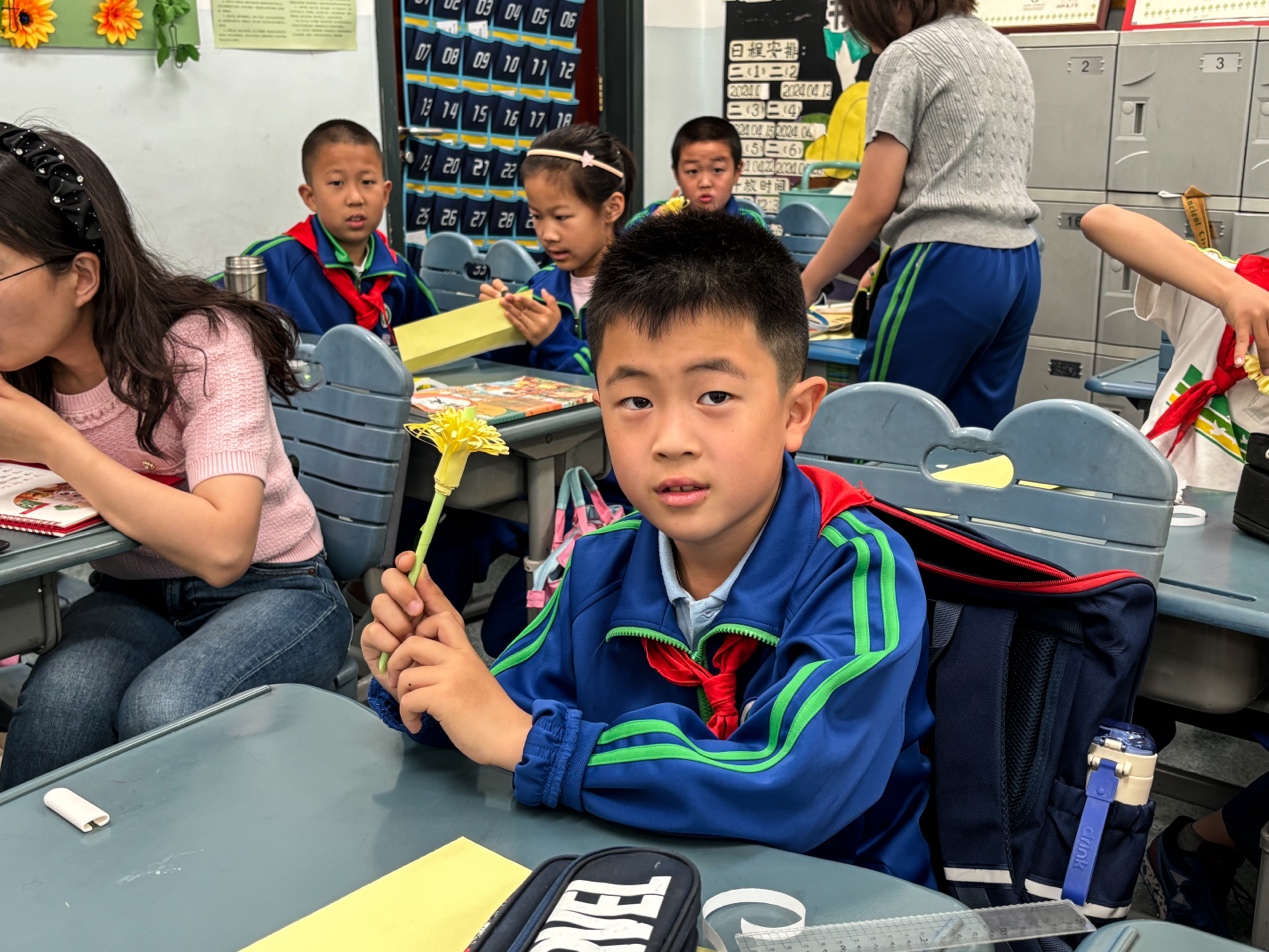 乌日罕、黄雨田同学向三(2)班简要介绍了中国的传统节日重阳节。她们以“重阳”二字的内涵引入,介绍了重阳节悠久的历史文化背景。随后,两位同学分享了重阳节登高远眺、赏菊饮酒、设宴祈福等传统习俗,并阐释了这些习俗背后蕴含的丰收祈愿、驱邪避灾的内涵。接下来,学社成员将目光转向与重阳节联系紧密的传统习俗——赏菊,这一活动承载着尊老孝亲的深刻意义。同学们也希望能通过折纸的方式,亲手制作菊花,表达对长辈的感恩和祝福。