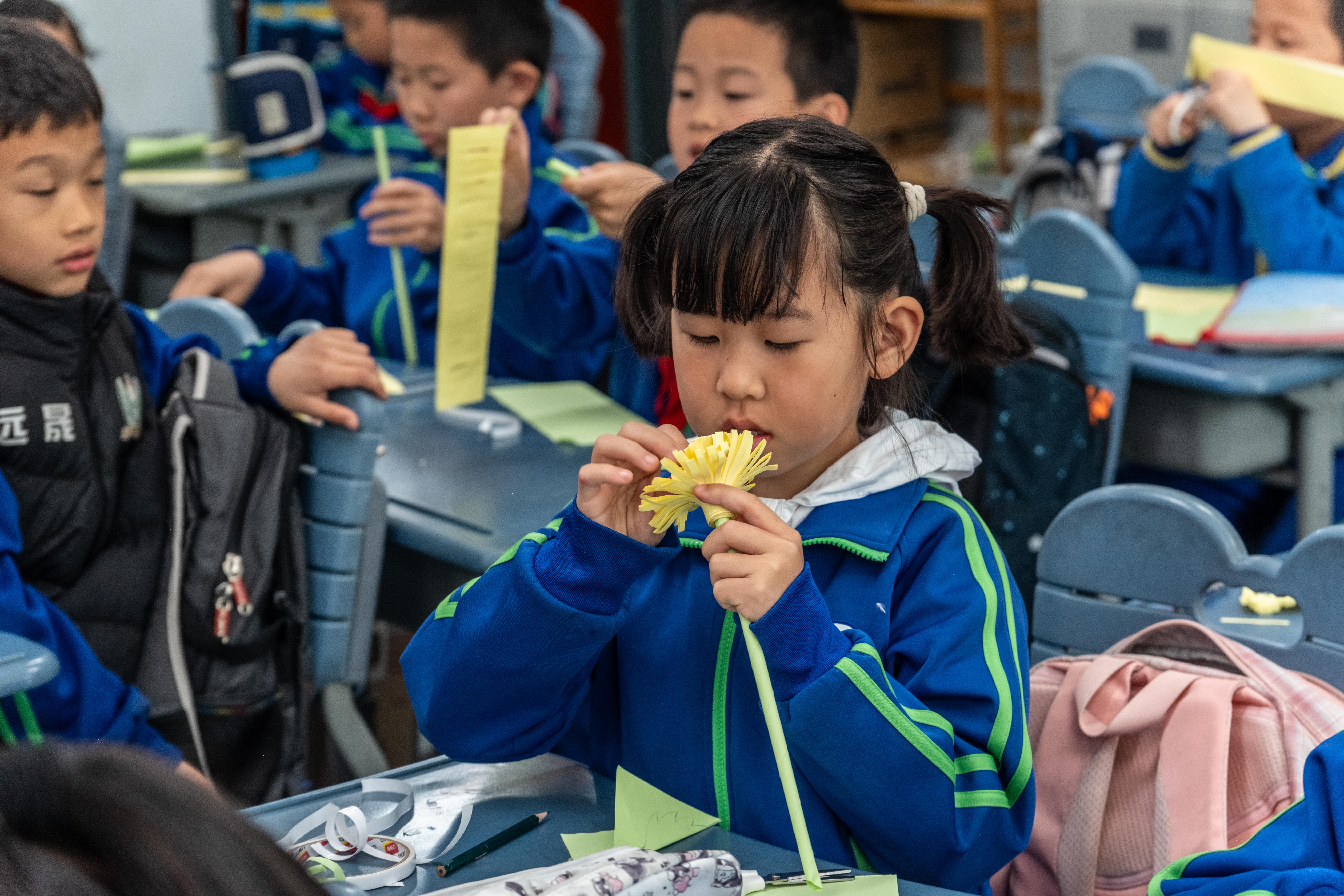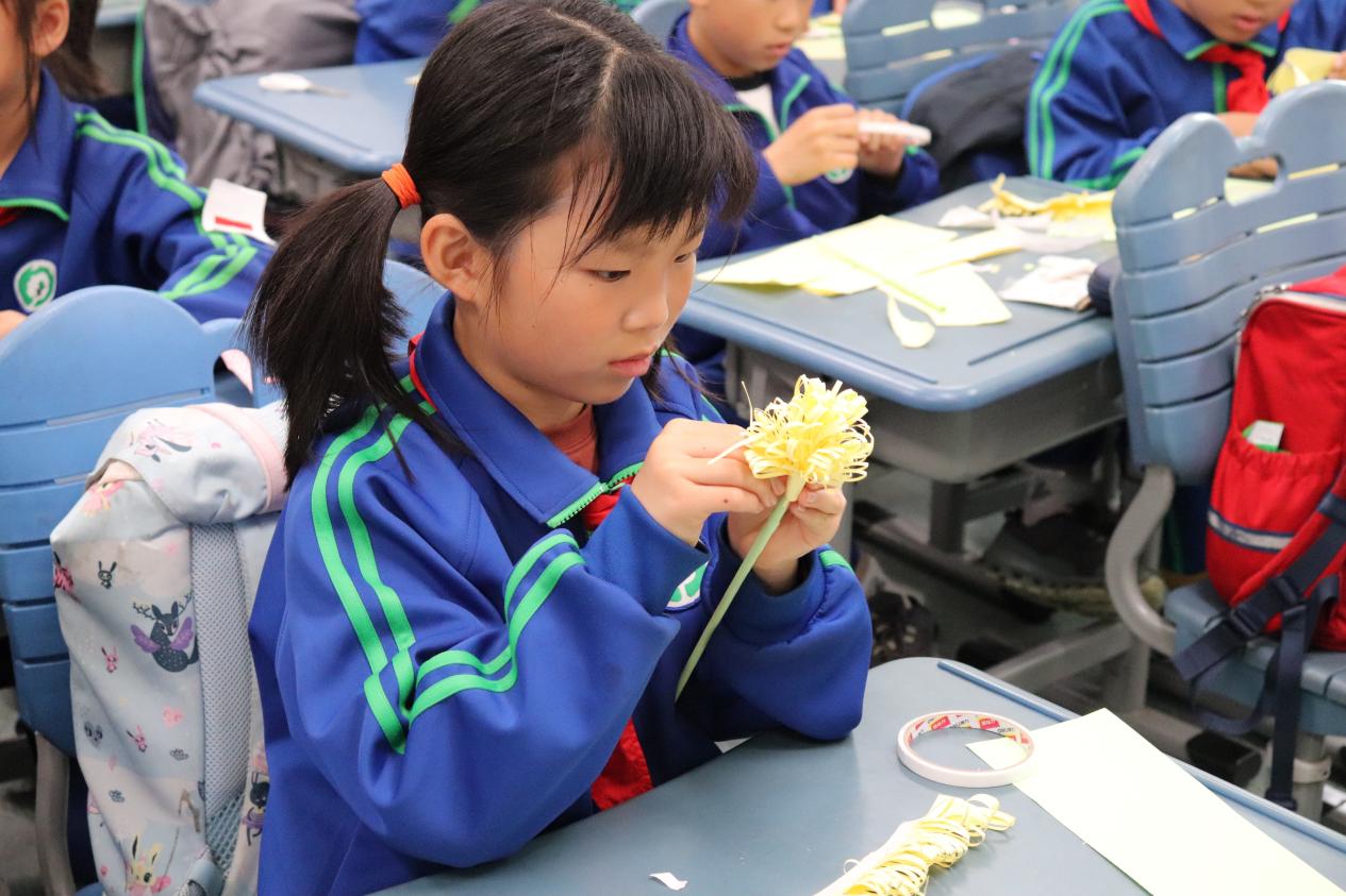 随后,学社的两位小老师亲自示范,向同学们展示了制作菊花折纸的方法及技巧。在老师的悉心指导下,同学们迅速掌握了制作要领。经过一番努力,同学们用一张张彩纸折出了各式美丽的菊花,在民俗体验中加深了对中华优秀传统文化的理解和认同。