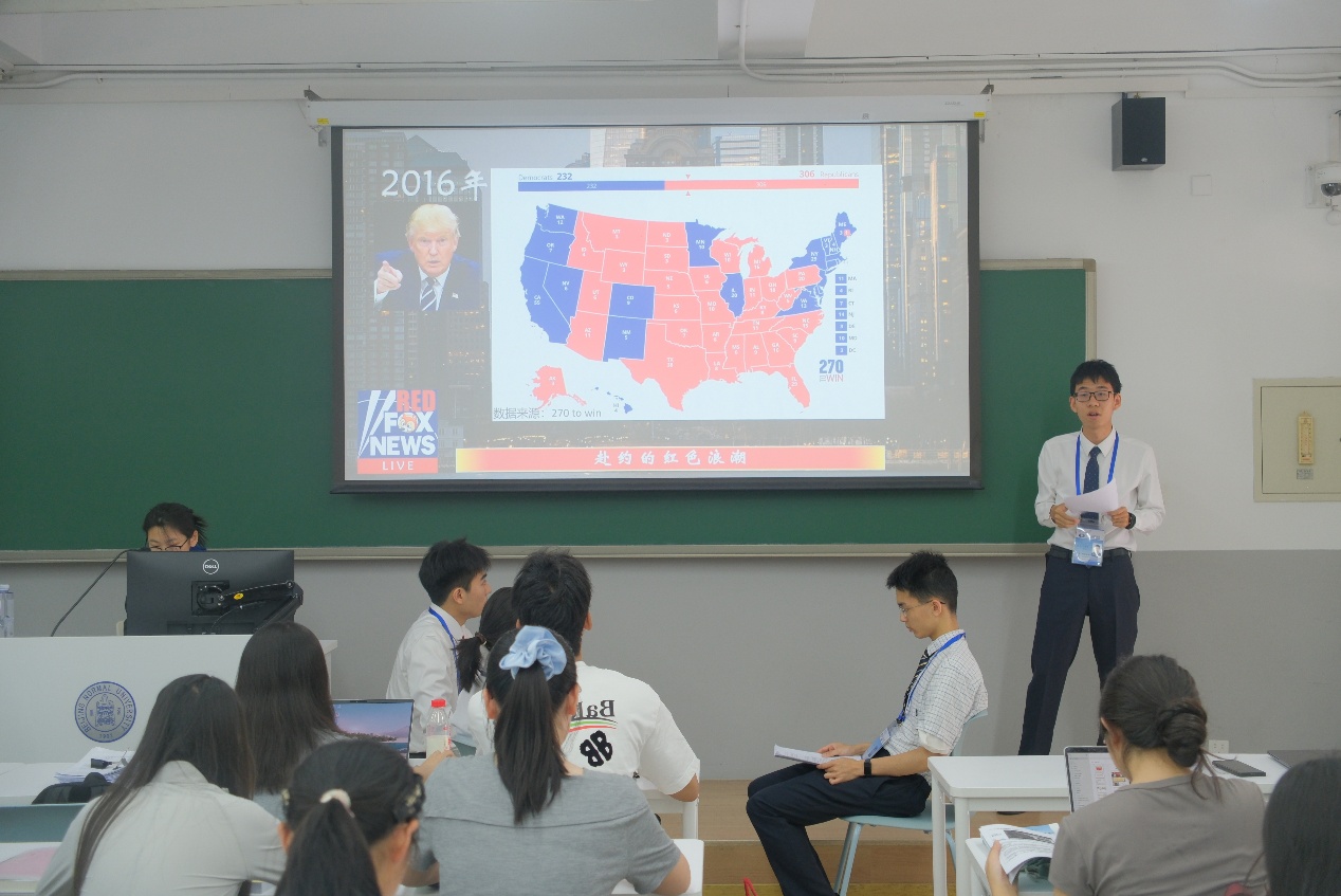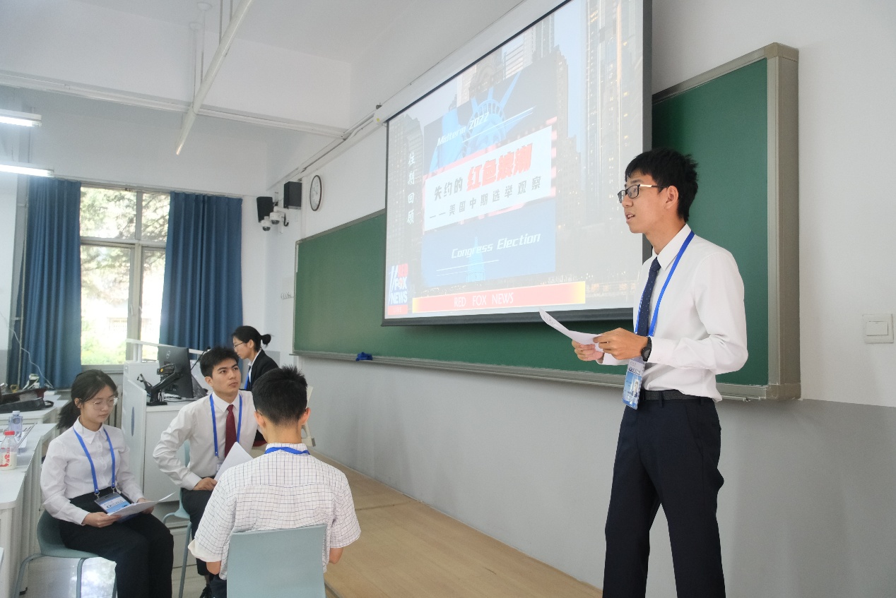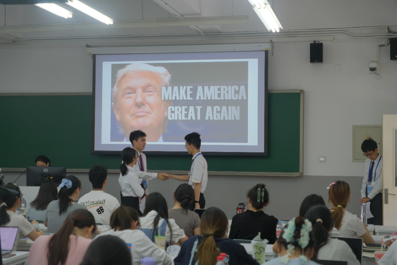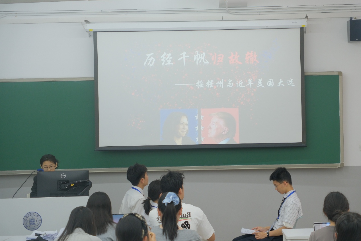 第二场授课是张琰泽、王涵禹、袁宇、樊晨曦、杨春喜带来的《历经千帆归故辙——摇摆州与近年美国大选》。新闻主持人王涵禹聚焦2024年美国大选结果,分析关键摇摆州选举人票尽数落入共和党阵营的选情,进而剖析前总统特朗普的胜选原因。张琰泽(饰演参议员候选人戴维斯)、袁宇(饰演宾夕法尼亚大学教授布鲁克斯)、樊晨曦(饰演政治顾问莱莉),以铁锈地带白人蓝领群体及拉丁裔选民为样本,系统梳理不同选民群体的核心诉求,并围绕能源政策、通胀治理、社会议题及堕胎权等焦点问题,深入探讨了共和党在本次大选中的优势与策略布局。最后,新闻主持人王涵禹对特朗普政府未来施政方向进行了前瞻性分析。四位同学通过角色塑造与诙谐的叙事表达,立体呈现出共和党的胜选图景,获现场师生好评。