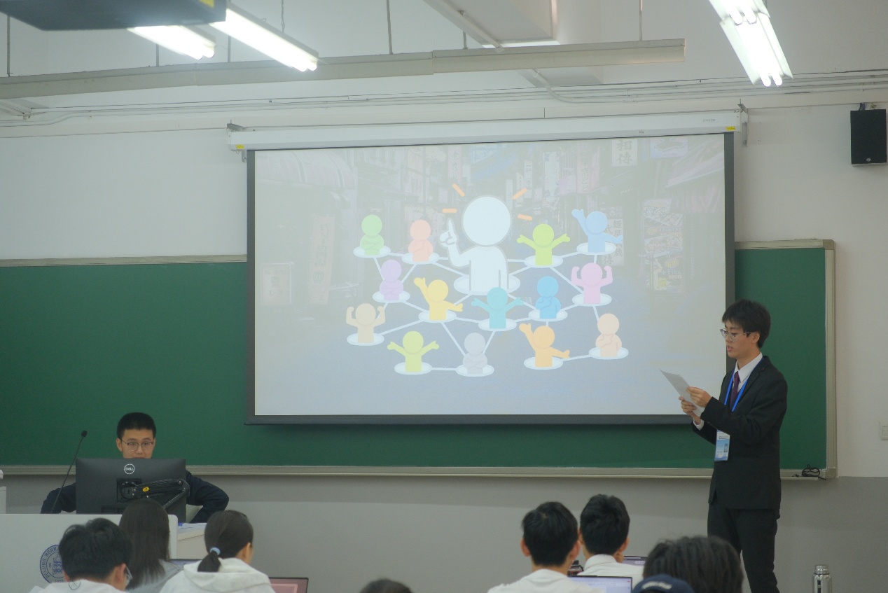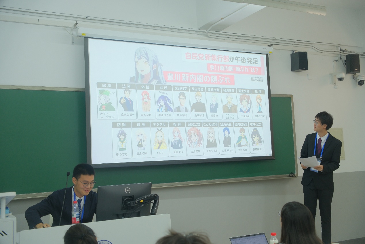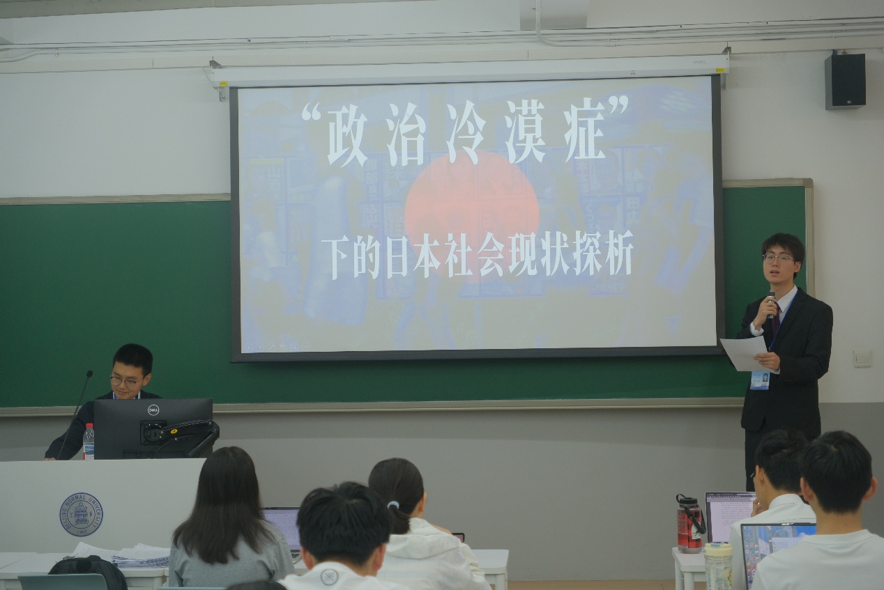 第一场授课是刘臣远、高元带来的《政治冷漠症下的日本社会现状探析》。主讲人刘臣远从2024年日本众议院选举切入,从政治运作、地方关系、经济状况三个维度入手,结合对日本政坛的观察和对日本历史的分析,揭示了导致日本社会年轻人的“政治冷漠症”的病因——世袭的政治贵族、地方的利益关系网、低迷的经济现状。在展示中,两位同学借用日剧、动漫等同学们感兴趣的文艺作品,生动地复现了日本存在的社会矛盾,引发同学们对相关问题的思考。