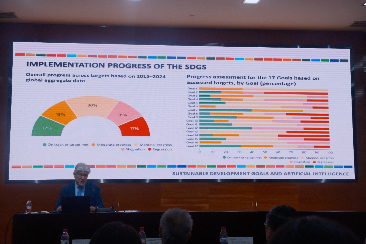 法布里齐奥先生首先介绍了联合国可持续发展目标(SDGs)的核心内涵,并重点阐述了人工智能技术对实现可持续发展目标的关键作用于潜在挑战。他指出,人工智能的运用将有力推动可持续发展目标的如期实现,但也可能在某些目标的达成过程中成为“抑制剂”。法布里齐奥先生特别提到,至2030年这一重要时间节点,人工智能有望为全球经济贡献高达15.7万亿美元的增长,而这也将为中国乃至全世界带来重大发展机遇。
