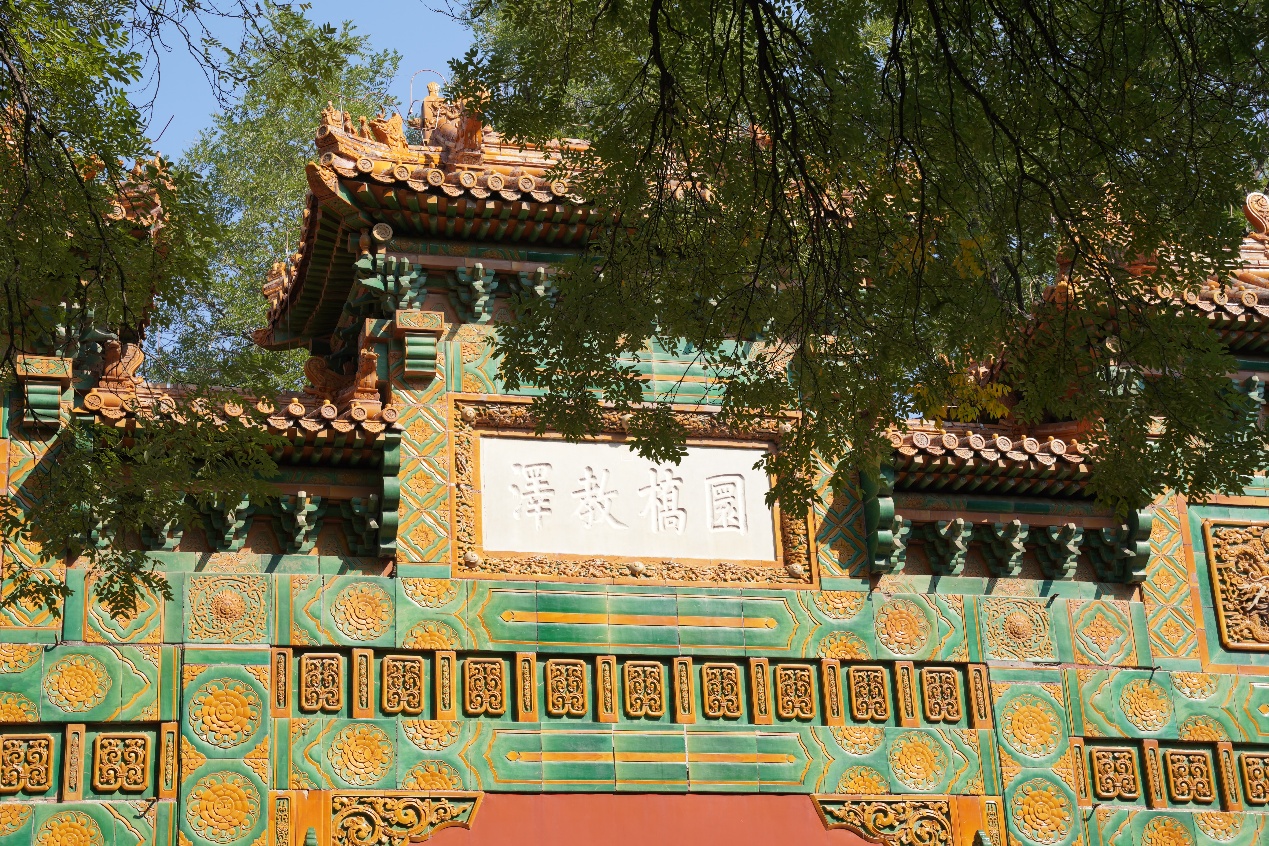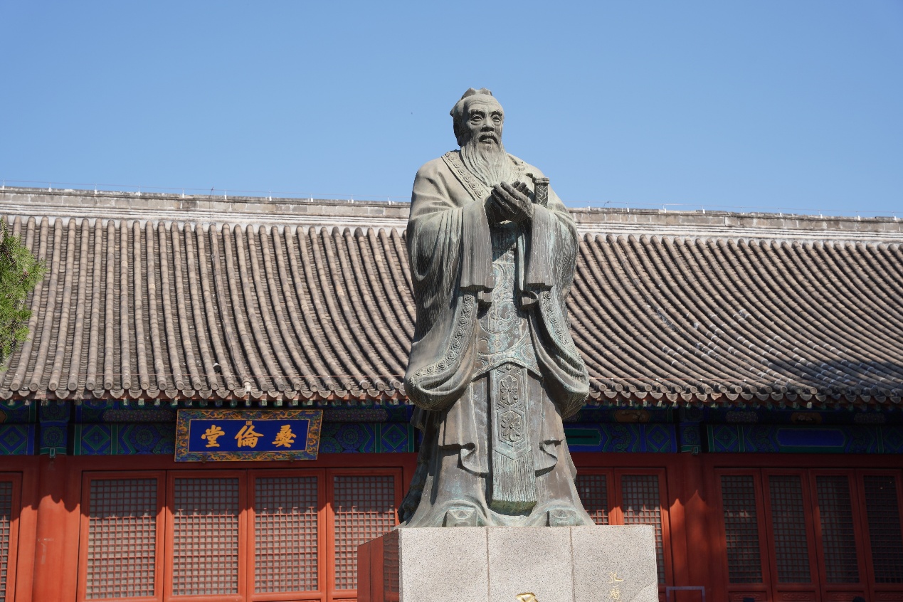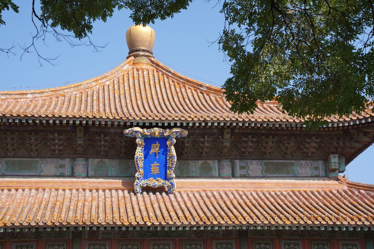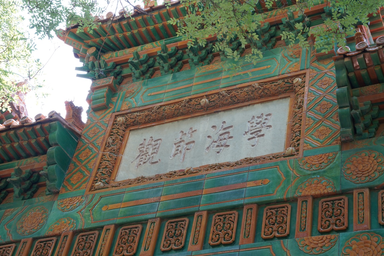 穿过太学门,一座三间四柱七楼庑殿顶式琉璃牌坊巍然矗立。横额正面题乾隆御书“圜桥教泽”,背面为“学海节观”,寓意讲学兴盛、学子云集。这是全国唯一一座专为教育而设立的牌坊,也是中国古代崇文重教的象征。在王胤兆师兄鞭辟入里的讲解中,同学们了解到牌坊题字的深刻文化内涵,更体悟到作为北师大学子当有的教育精神与情怀。沿中轴线行进,在苍松翠柏环绕、红墙黄瓦的点缀中,典雅庄重的辟雍大殿映入眼帘。殿前碧水环绕,白玉石桥横跨其上;殿内则开阔恢宏,金碧辉煌的龙椅居于正中。辟雍是国子监最为重要的建筑,乾隆皇帝就曾在此讲学。同学们在石桥前驻足,或三两合影,或凝神静思,品读这座“行礼乐、宣德化”的重要场所。行至彝伦堂前,同学们面对孔子立像集体鞠躬,表达敬意。