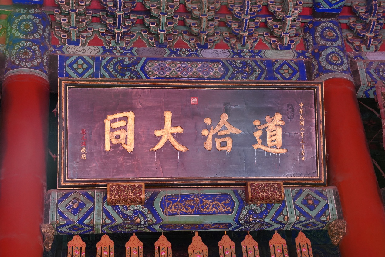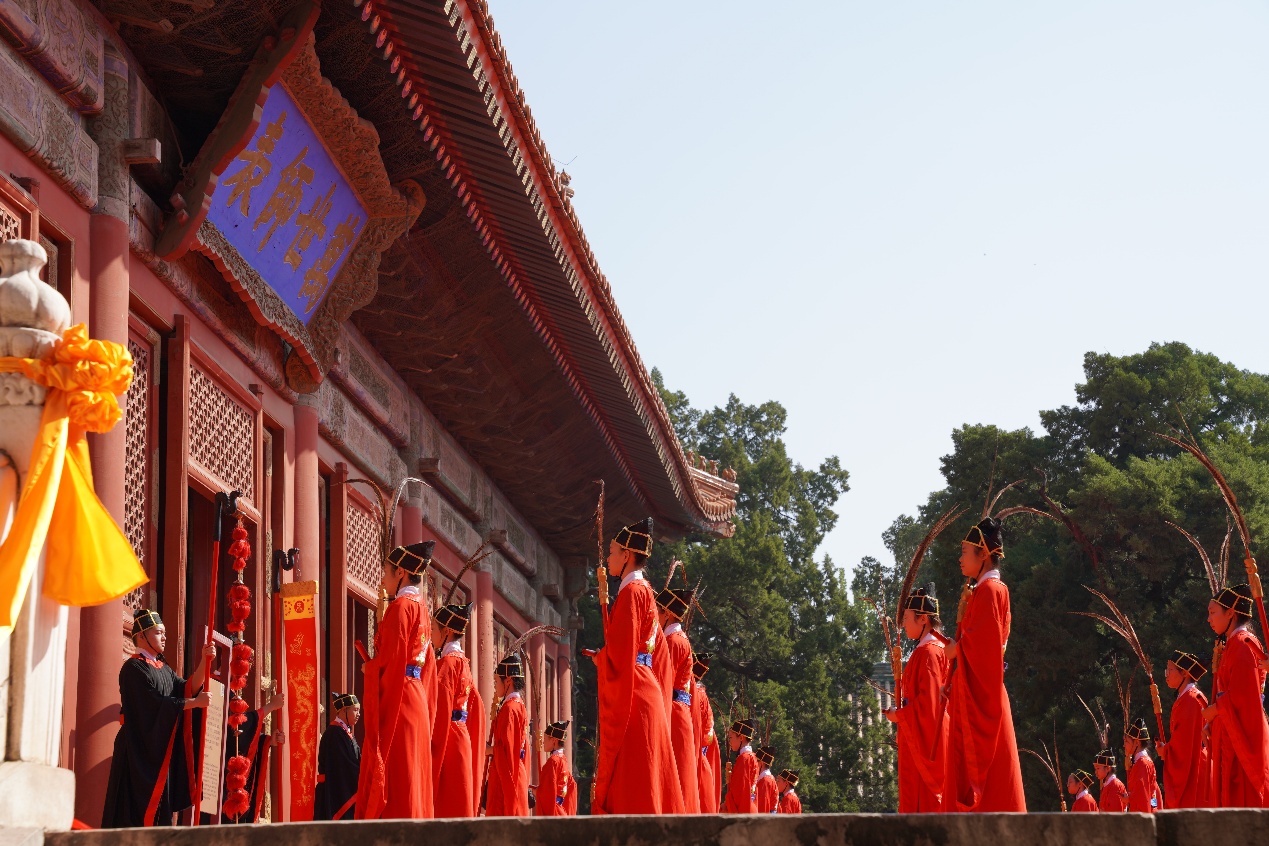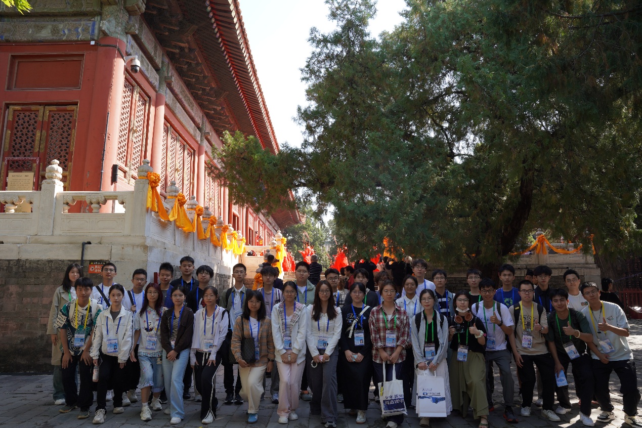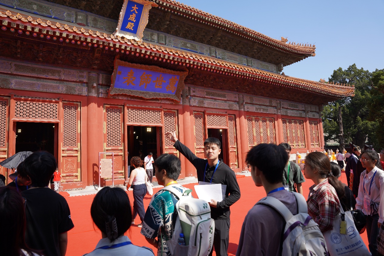 随后,同学们经由持敬门,进入位于国子监东侧的孔庙参观,并有幸现场观摩了纪念孔子诞辰2576周年的祭典仪式。“启户——”典礼官扬声唱诵,悠远肃穆。“万世师表”匾额下,佾生手持羽籥,踏着雅乐缓步而行。大成殿前燔柴炉青烟袅袅升起,好似与云霞相接。钟磬声里,八佾舞生广袖翻飞,如白鹤翔集。祭典后,同学们依次参观了大成门、大成殿、十三经刻石等文化遗迹,对于传统经学、礼乐文化以及孔子的教育思想有了更为深刻的理解。