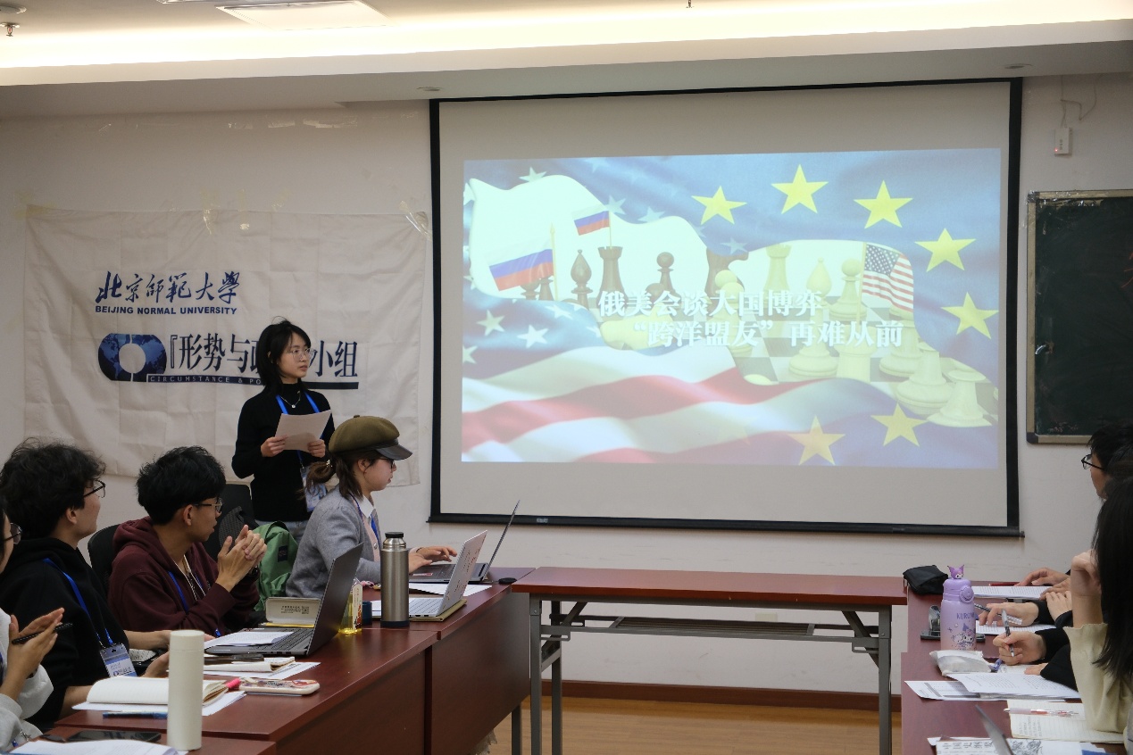 小组2024级观察员樊晨曦以《俄美会谈大国博弈 跨洋盟友再难从前》为题,剖析了“特朗普2.0”时代俄乌冲突中各方势力消长及和谈进程背后的利益交锋,强调了世界多极化趋势的不可阻挡。2019级组员、原组长许宸睿(现于法国图卢兹第二大学交换学习)等以视频方式作点评。他们对分享同学精辟独到的个人见解、精美生动的幻灯制作给予高度评价,并分别从目前所处国家出发,分享了欧美各大国政府及民众对俄乌冲突的态度立场。点评师兄还结合英国首相斯塔默和主要在野政党近期声望民调作了讲解。此外,2024级院系联络员王涵禹和王梓煜还聚焦特朗普第二任期伊始的时间节点,分别就美国关税政策和新自由主义思想进行补充,为同学们全方位了解地区政局提供了多元视角。