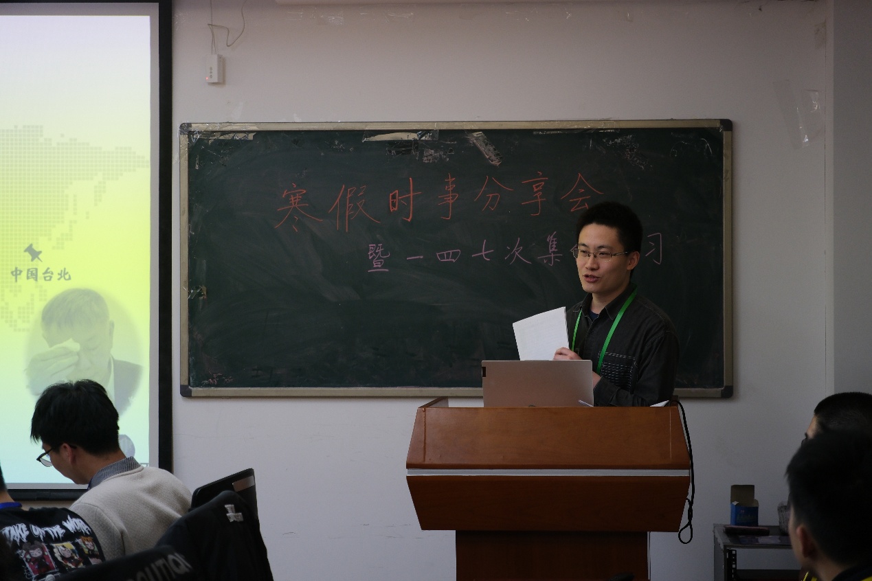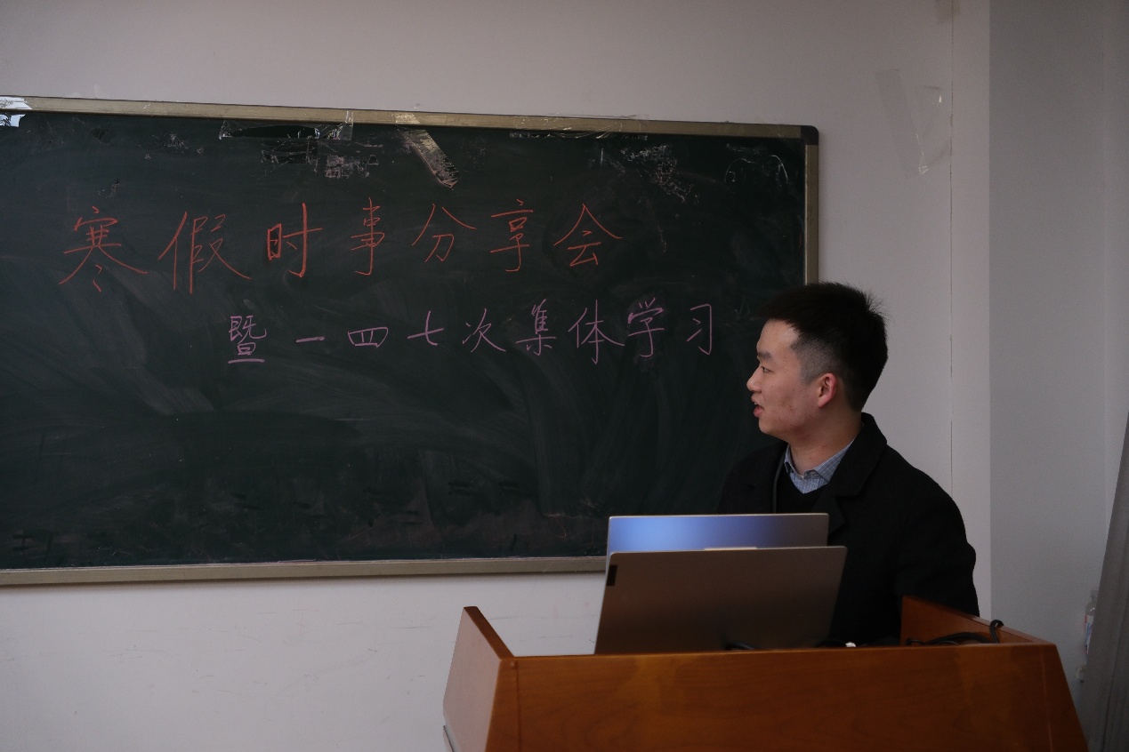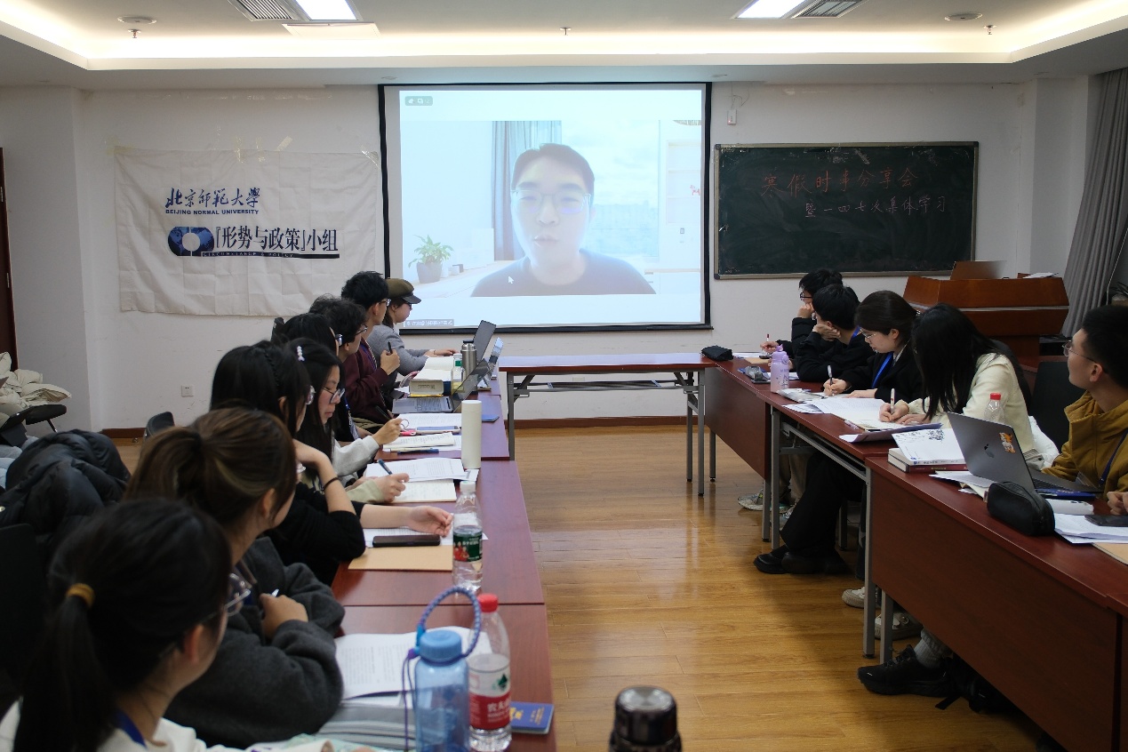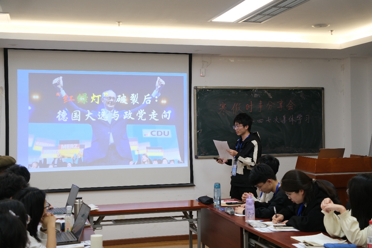 寒假期间,小组2024级新成员围绕近期国际时政前沿热点选题,基于新闻资讯阅读、整理,完成并提交了时事分析书面作业。张熹对同学们的作业进行了简要点评讲解,并邀请樊晨曦、伍泽榕、刘臣远和李彬镜四位同学上台进行时事分享。