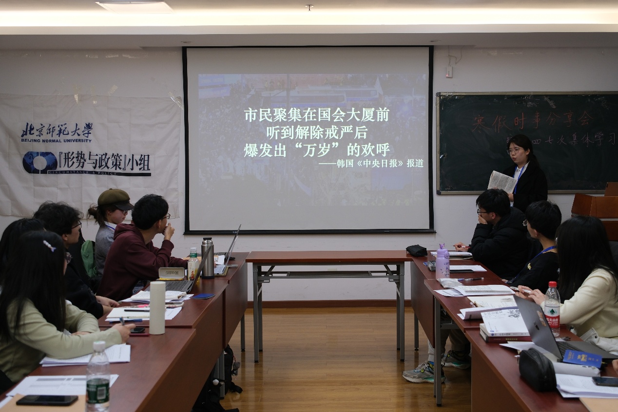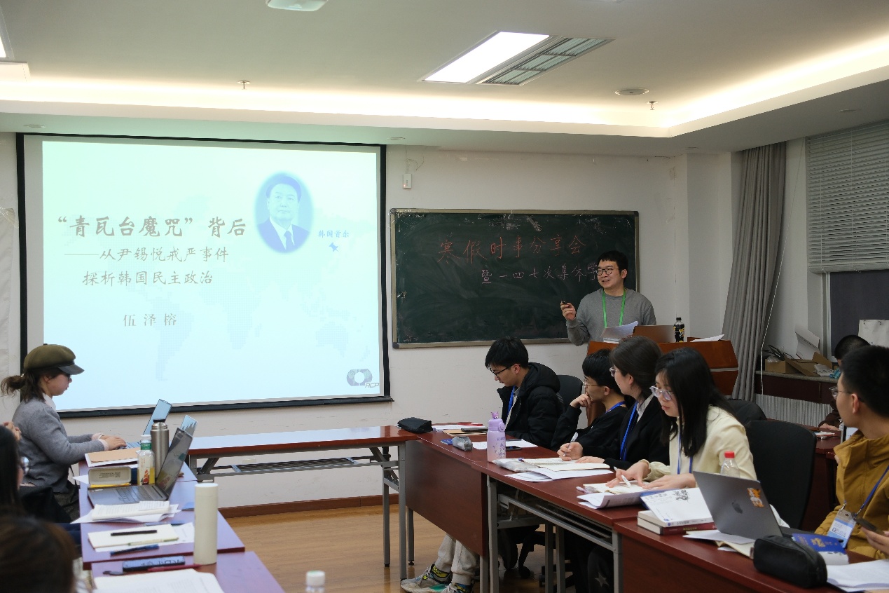 小组2024级组员伍泽榕围绕去年年底震惊全球的韩国戒严事件,作题为《“青瓦台魔咒”背后:从尹锡悦戒严事件探析韩国民主政治》的主题分享。她重温了戒严事件始末及事后对总统尹锡悦的弹劾逮捕过程,分析了近四十年来韩国民主政治的发展进程,在肯定其阶段性进步的同时也指出其结构性问题。小组2012级院系联络员、点评师兄肯定了分享同学对这一话题的驾驭能力,并通过韩、日等东北亚主要国家间的局势对比,补充介绍了韩国国内各地区在内政和外交事务上的分化现实和极化趋向。