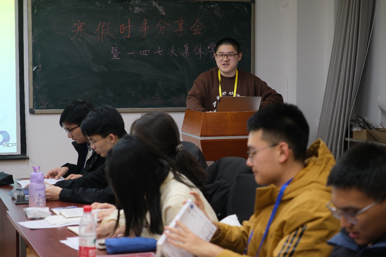 2025年3月5日晚,“形势与政策”小组在主楼A653教室举办寒假时事交流会暨第一四七次集体学习。小组第十八届领导团队成员、2024级新成员参会,高年级成员代表作为点评分享嘉宾以线上、线下相结合的形式应邀出席。活动由组务总监张熹主持。