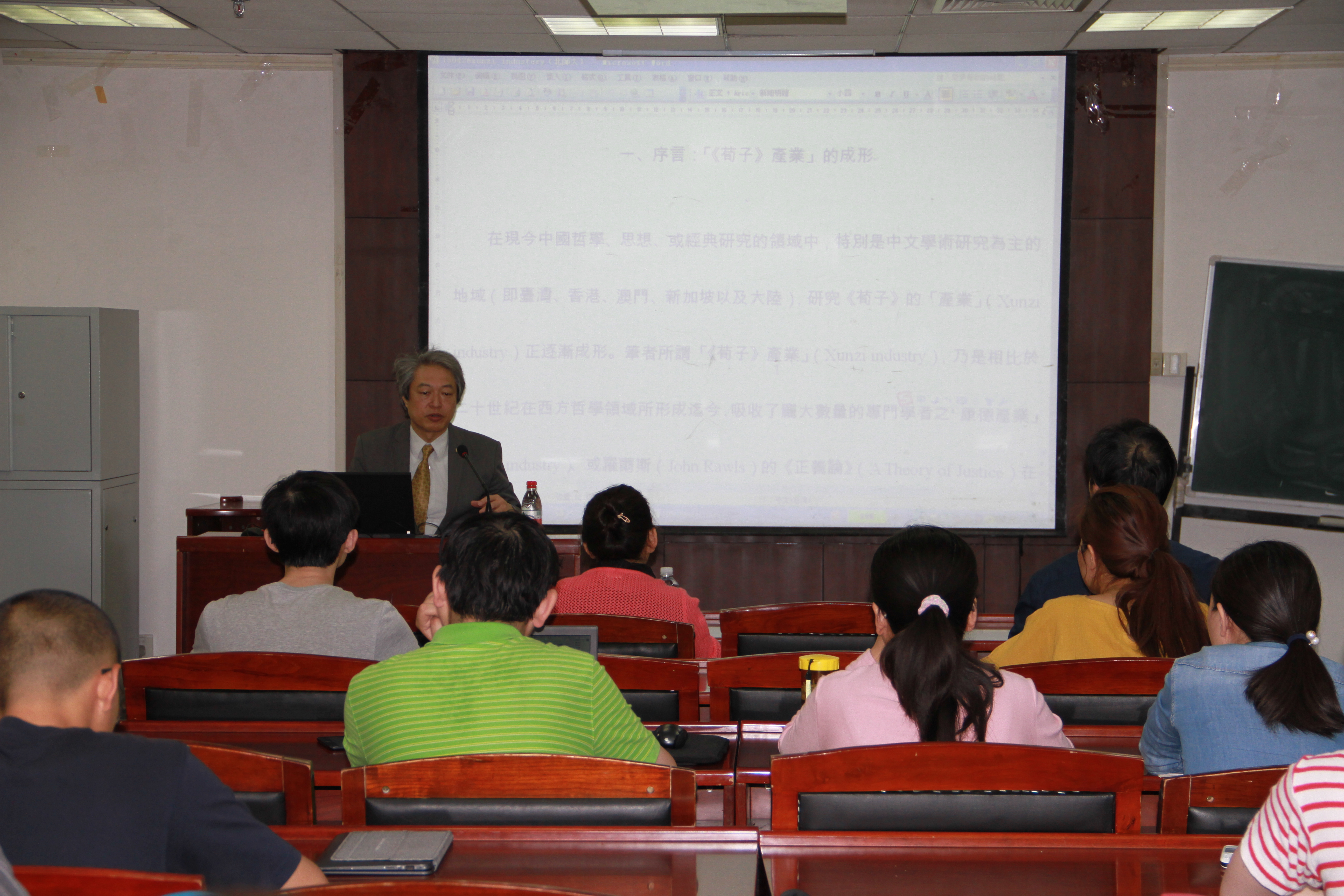 4月27日上午10点,台湾大学哲学系教授佐藤将之在主楼600教室为我院学生作了题为“台湾和日本《荀子》思想研究的特点”的讲座。首先,佐藤将之教授就如何选择研究《荀子》的资料及研究方法论问题提出见解。他认为,研究者面对超过五千笔的关于《荀子》研究的学术著作,通过参考评述性论文便可以理解《荀子》研究的主要脉络,关于《荀子》研究的方法论,他提出应摒弃《荀子》研究的一种潜在的态度或成见所引之的问题,比如对《荀子》的思想特质的定位和历史意义已有的坚固的成见。其次,佐藤将之教授对《荀子》与战国诸子关系等问题提出自己的见解。他指出,荀子和韩非子属于不同的学术脉络。接着,佐藤将之教授介绍了台湾《荀子》研究状况,主要介绍新儒家传统下《荀子》的研究,如牟宗三、劳思光等。最后,佐藤将之教授介绍了日本《荀子》研究历史与状况。他简要介绍了井上圆的《读荀子》,久保爱的《荀子增注》,《汉文大系》中的《荀子》卷等日本学者《荀子》研究。