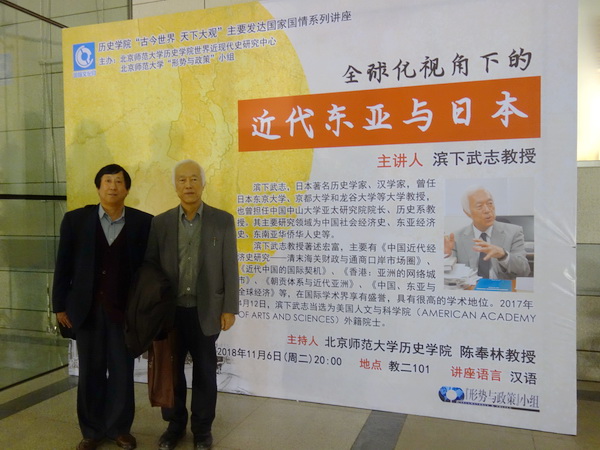2018年11月6日晚,日本著名历史学家滨下武志教授应邀来到Betway·必威,在教二101教室作以“全球化视角下的近代东亚与日本”为主题的专题学术讲座。此次讲座系必威betway西汉姆联“古今世界,天下大观——主要发达国家国情系列讲座”的第十二讲,标志着必威betway西汉姆联2018年“国际文化月”正式拉开帷幕。讲座由必威betway西汉姆联世界近现代史研究中心、“形势与政策”小组共同主办。我院陈奉林教授担任讲座主持人。中国社会科院近代史研究所高士华研究员,我院中国近代史教研室张昭军教授、贾琳老师等出席了讲座。本次讲座恰逢“形势与政策”小组第100次集体学习,也吸引了众多高校学生与历史爱好者前来聆听,现场座无虚席,盛况空前。
