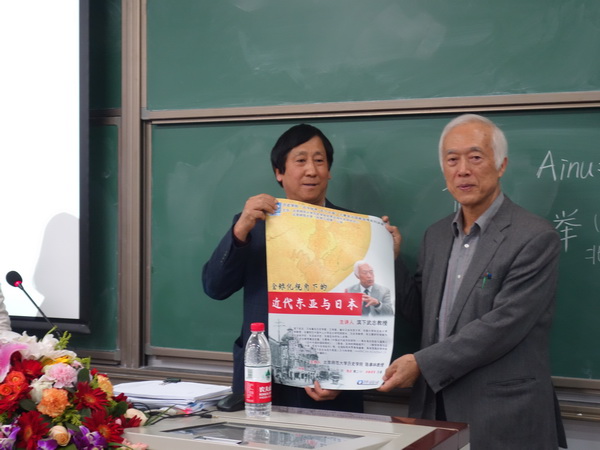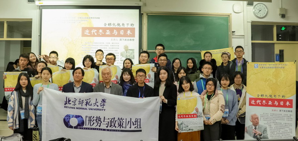 在一个半小时的学术报告中,滨下武志教授全程使用汉语与大家交流,其精彩的演讲获得了在座师生的一致好评。陈奉林教授向大家介绍了滨下教授“席不暇暖”的探索精神:教授虽已年逾古稀,但依然精力充沛,经常奔赴世界多地查找资料,进行田野调查,保持着高度的学术创作热情,不断开拓新的研究领域。滨下教授的学问和精神都值得我们认真学习。讲座结束之际,滨下武志教授欣然接受了陈奉林教授代表主办方赠送的讲座海报,并同“形势与政策”小组成员合影留念。