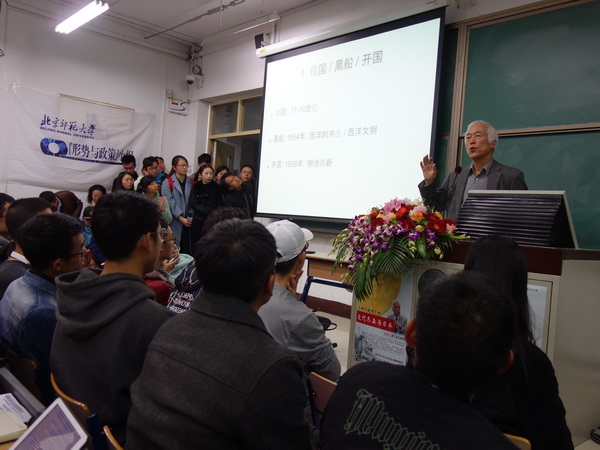 晚7时50分,精神矍铄的滨下武志教授步入会场,全场顿时爆发出热烈的掌声。滨下教授健步登上讲台,表达了来到北师大讲学的兴奋与喜悦之情。他指出,本次讲座旨在分享全球化视角下针对近代东亚与日本历史的研究心得。滨下教授首先介绍了日本知识界传统分野下的“西洋派”、“亚洲派”与“日本派”,概括了各派学者从不同角度对近代东亚与日本历史的认知。“西洋派”熟稔自江户时代“兰学”发展而来的“洋学”,热衷传习西方科学文化知识,认同西方学者提出的“冲击—回应”模式,认为锁国政策是造成江户日本封闭、落后的根源,而西洋文明冲击下的明治维新是推动日本向近代转型的主因;“亚洲派”推崇汉学(东洋学/中国学),主张从日本与东亚内部的传统因素中寻找其近代化的条件,不仅指出锁国时代的日本仍通过“朝贡”等商业网络维系其与东亚乃至域外世界的联系,且强调明治维新后华商赴日开展投资与贸易活动,是洋商之外推动日本工业化与近代化进程的又一重要因素;“日本派”则尊奉日本的“和学”为国学,提出以日本为中心的华夷秩序,倡导“尊王攘夷”式的排外运动,从而确立起日本民族的主体性地位。循此理路,20世纪初的日本知识界内部产生了三种分析东亚的学问:主要受“兰克史学”影响的“西洋史”、注重东亚传统的“东洋史”、以日本为主体的国史与对外交涉史。