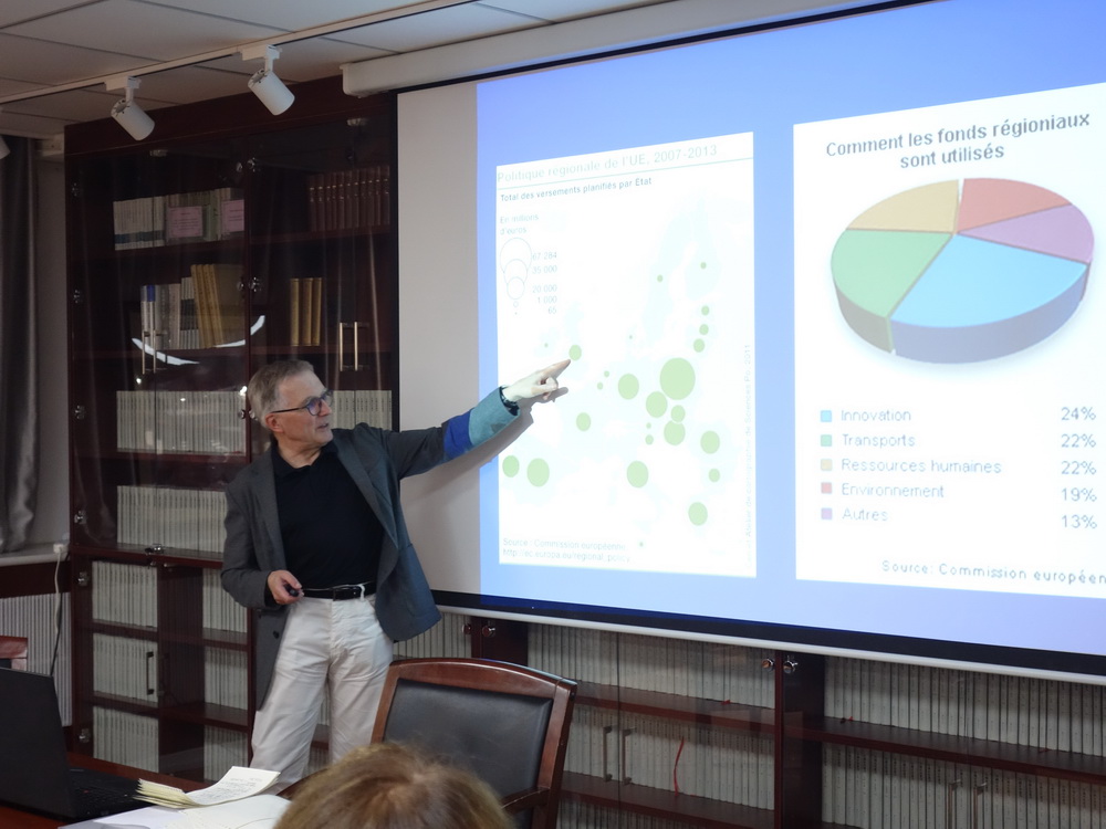 关于今日欧洲的情况,巴尔若教授认为,欧洲一体化进程仍在发展演进之中,当前欧盟正面临着错综复杂的内部问题与外部压力。在欧盟内部,英国“脱欧”议题长期悬而未决,民粹主义思潮愈演愈烈,经济衰退引发高失业率等社会问题,欧元区的建设亦面临诸般难题。在欧盟外部则不光有形势严峻的难民问题,而且随着世界政治格局出现变动,欧盟需要调整同世界与区域范围相关国家的关系。面对这样的现实情况,欧洲国家不仅需要进一步加强合作,更要通过回顾历史来汲取经验教训。教授用一组图表向在座师生展示了欧盟共同政策的成就与不足,如欧洲各地经济发展不平衡,使欧盟的统一货币政策备受争议。巴尔若教授最后总结指出,欧洲一体化是一项系统工程,它已经走过了漫长的历史,取得了比较丰硕的成果。在机遇与挑战并存的今日,欧洲一体化进程仍任重道远。