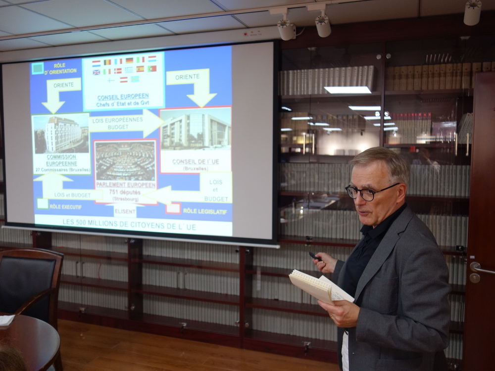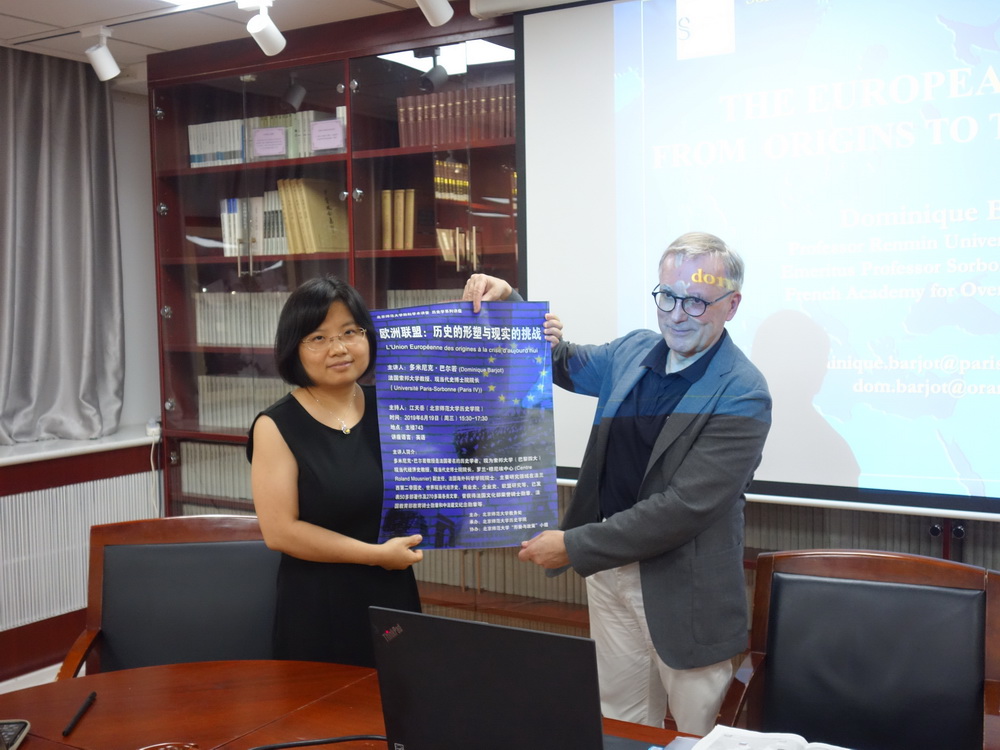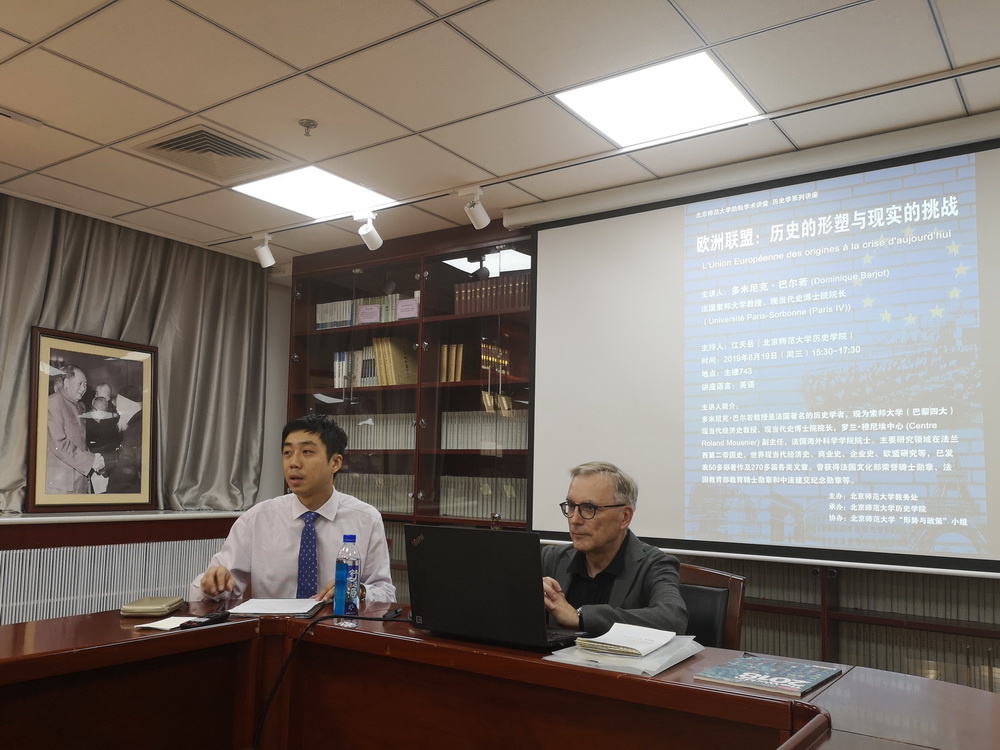 2019年6月19日下午,法国著名历史学家、索邦大学荣休教授、法国海外科学院院士巴尔若(Dominique Barjot)应邀到访我院,并以“欧洲联盟:历史的形塑与现实的挑战”为主题,在主楼743会议室为师生作了一场精彩的专题讲座。此次讲座系我校励耘学术讲堂历史学系列讲座之一,由教务部主办,必威betway西汉姆联承办。讲座由我院世界近代史教研室江天岳老师主持,庞冠群副教授、贾珺副教授等学者出席了讲座。本次讲座还吸引了首都高校学生与历史爱好者前来聆听。