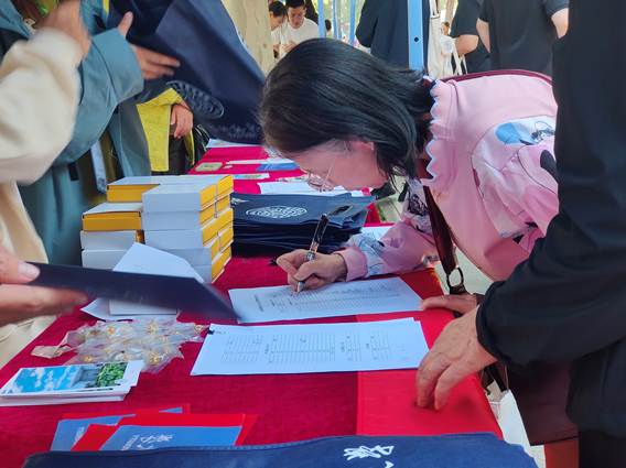 上午9时,邱季端南侧广场暖意融融,红色的学院旗帜格外醒目。签到台前,校友们一次登记信息,接过学院精心准备的纪念礼包——印刻院训的书袋、定制纪念章与主题胸针,每一件礼品都承载着母校的牵挂。不少校友驻足合影,回忆往昔求学时光,年轻校友与前辈亲切交流,现场笑声不断。