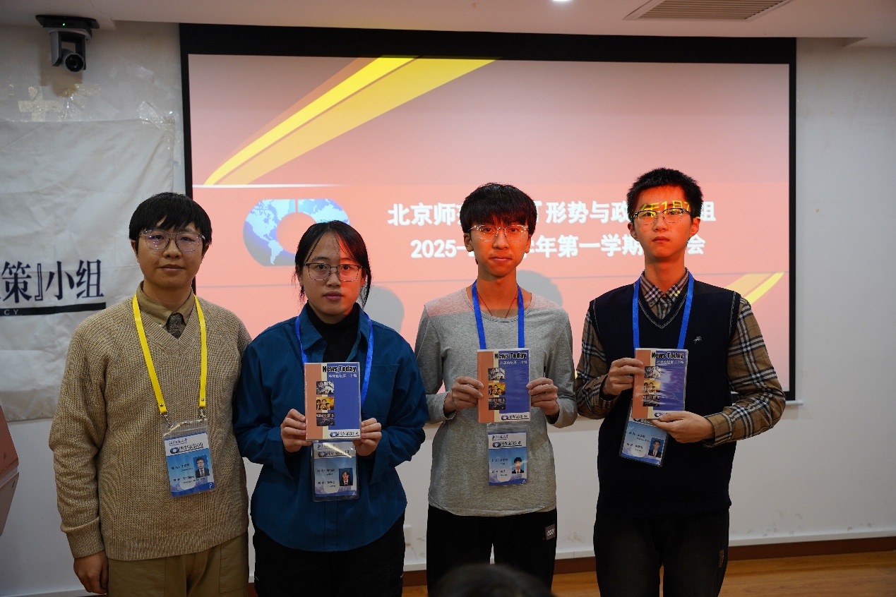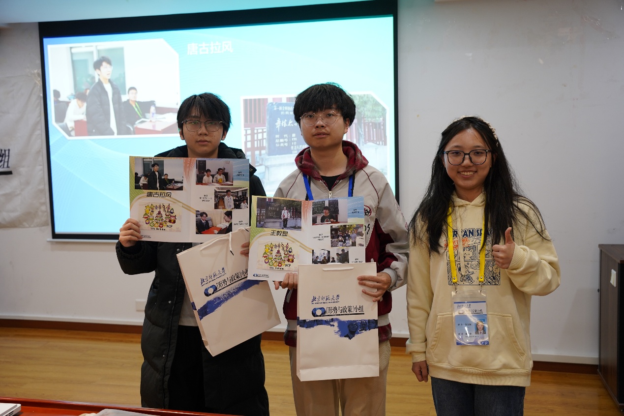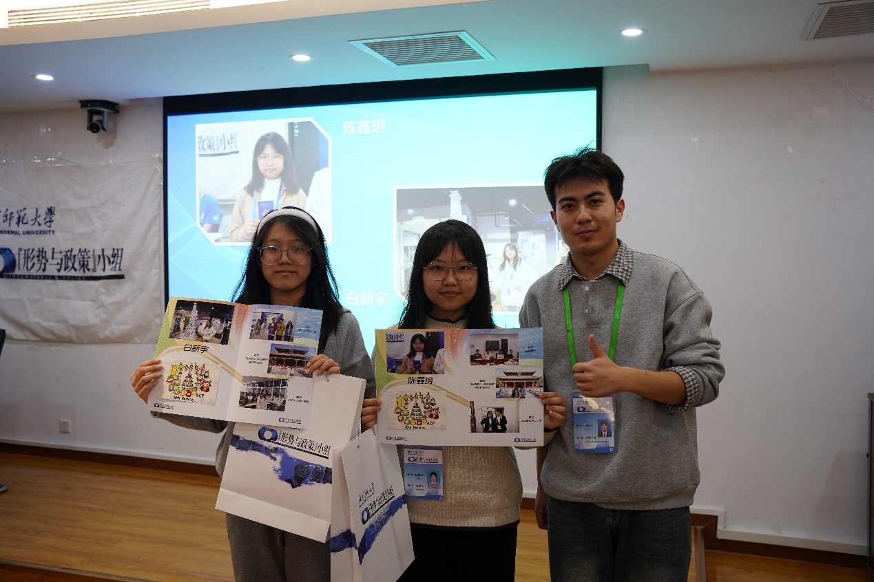 在2025年12月27日举行的“News Today”环球论坛第二十场上,小组2025级新成员自由组队、通力合作,精准剖析时事前沿热点,汇报展示获得了学校、学院领导嘉宾和专家学者的一致好评。小组宣传顾问丁旭辉向各队代表罗子键、刘采欣和张志航同学颁发纪念光盘,勉励他们继续为小组的建设和发展贡献力量。