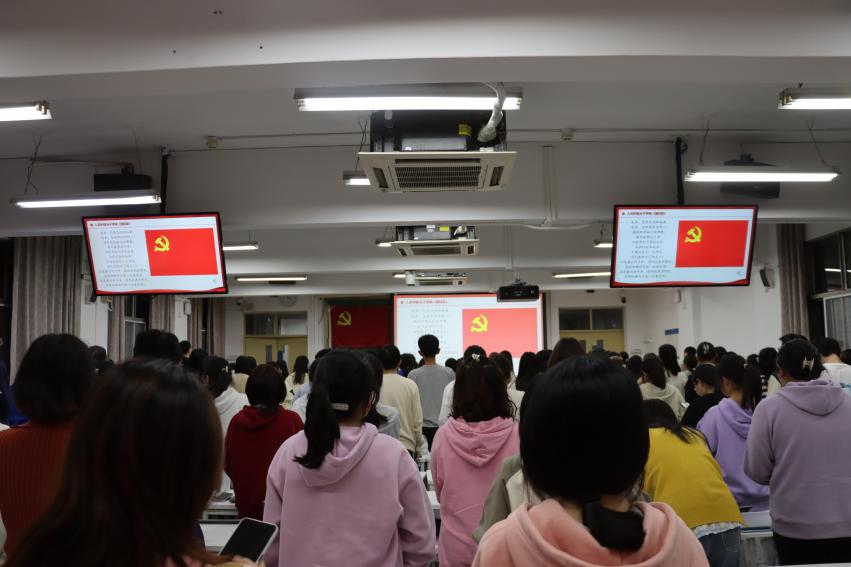 仪式最后,全体入党积极分子学唱《国际歌》。同学们跟随着音乐逐句学习,最终齐唱《国际歌》。入党积极分子们以严肃认真地态度进行学习,并在歌声中进一步增强了对中国共产党的认同感。