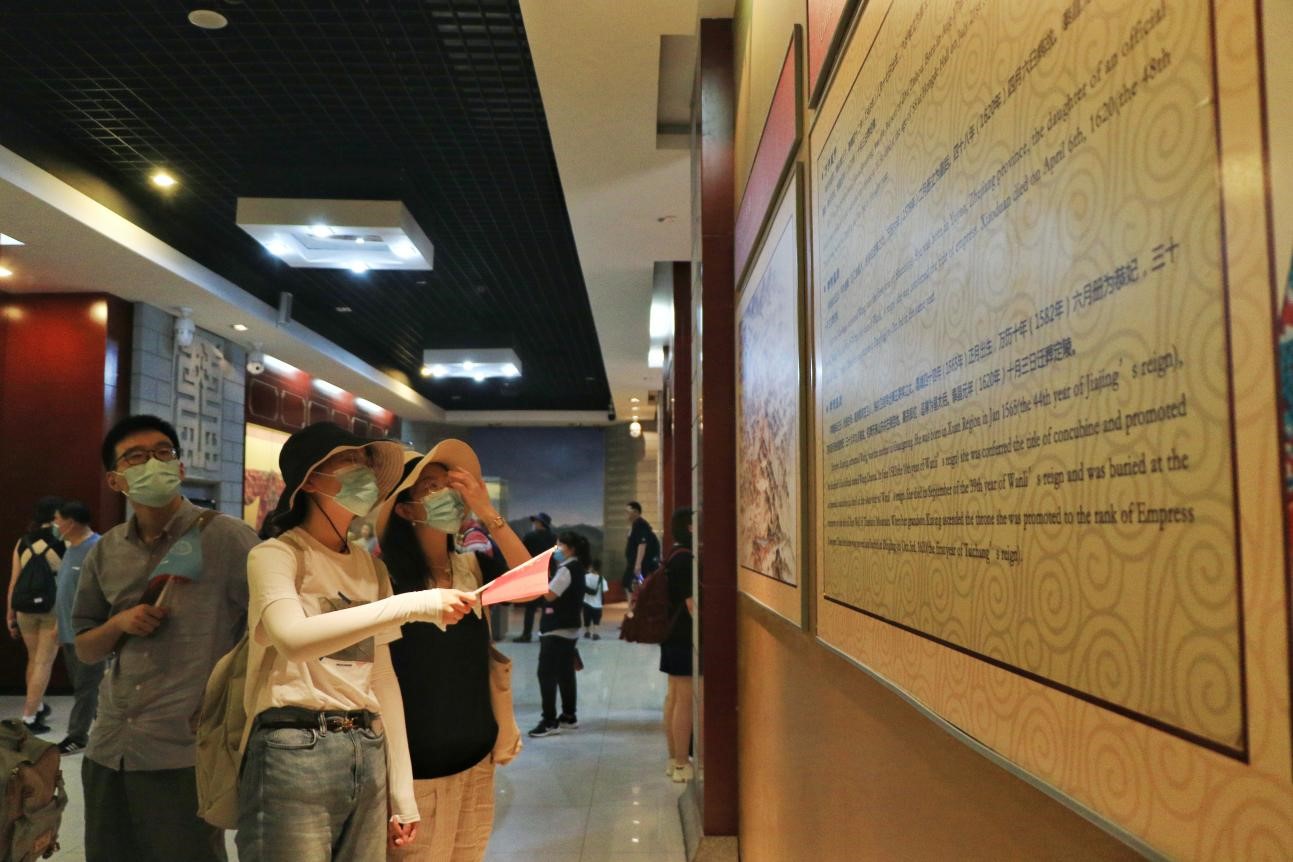 在参观完黄花城水长城之后,实践团队前往“明十三陵”景区进行社会实践,主要参观考察定陵博物馆。明定陵坐落在大峪山下,建于1584—1590年,是明神宗朱翊钧(年号万历)和他的两位皇后——孝端显皇后、孝靖皇后的合葬陵墓。首先,他们先后参观了定陵博物馆的两个展厅。
