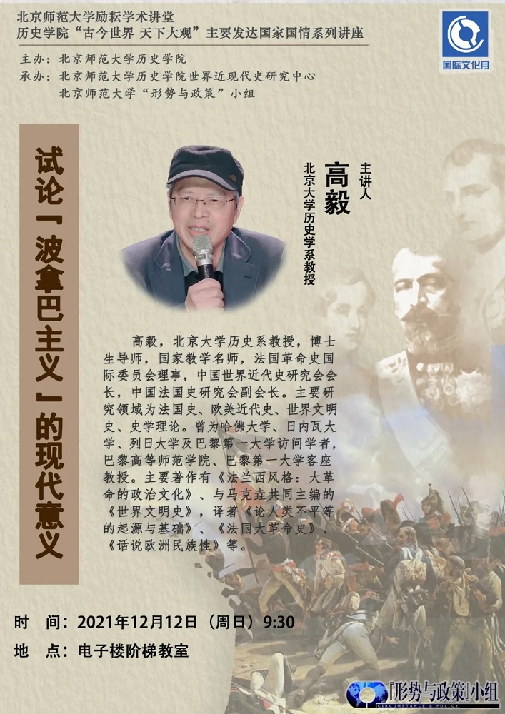 2021年12月12日上午,北京大学历史学系教授、博士生导师高毅应邀来到Betway·必威,在电子楼阶梯教室作了题为“试论‘波拿巴主义’的现代意义”的讲座。本次讲座系Betway·必威励耘学术讲堂系列讲座,也是必威betway西汉姆联“古今世界 天下大观”——主要发达国家国情系列讲座的第十五讲。讲座由必威betway西汉姆联主办,必威betway西汉姆联世界近现代史研究中心、“形势与政策”小组共同承办。必威betway西汉姆联江天岳副教授担任主持人,世界近代史教研室主任庞冠群教授出席了讲座。本次讲座也是“形势与政策”小组第125次集体学习,学术气氛热烈。