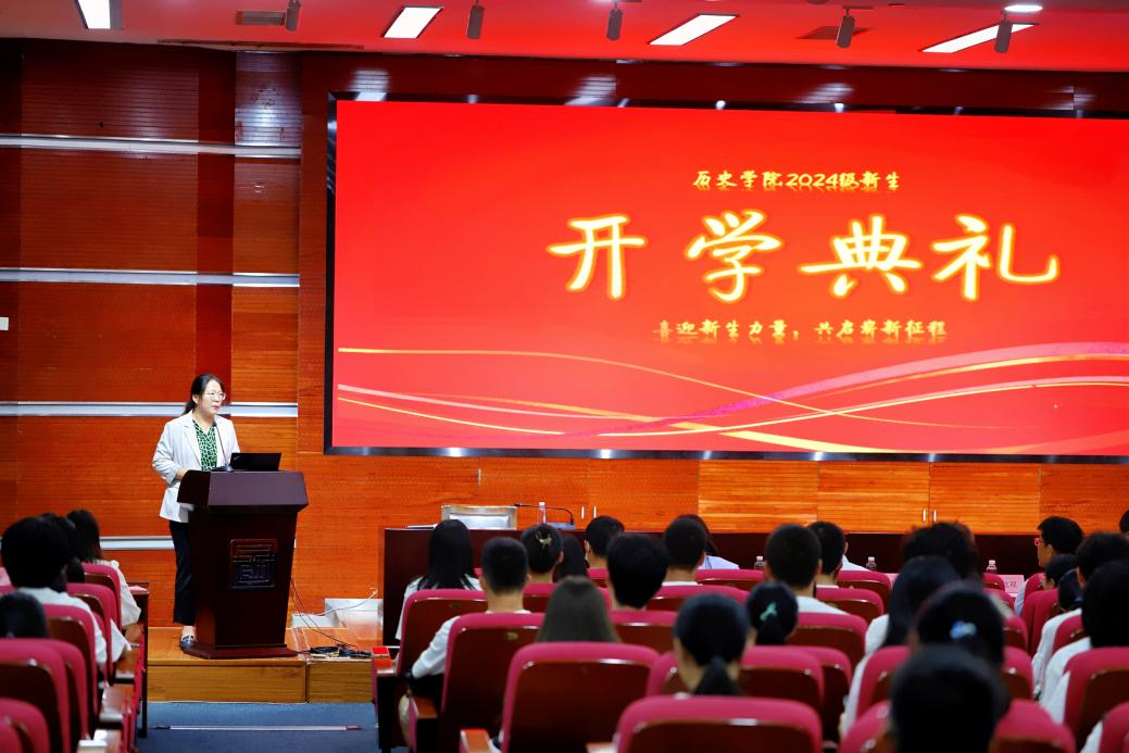 2024级本科生袁润雪代表本科新生发言,她表示对即将开启的大学生活满怀憧憬,并讲述了自己在不同阶段对历史的认识。
