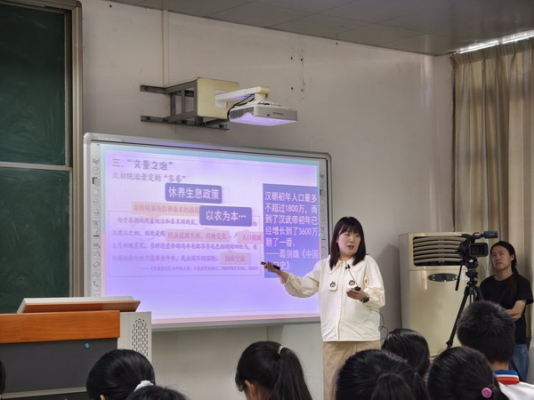 在初高中衔接组,深圳市新安中学(集团)外国语学校葛莹老师展示了初中课《西汉建立和文景之治》,以“辛追夫人的朋友圈”为线索,串联西汉初年的历史发展状况;广州执信中学褚福楼老师展示了初中课《大一统王朝的巩固》,依据史料详细讲解西汉巩固大一统的措施。广州执信中学张贤兵老师展示了高一课《西汉与东汉——统一多民族封建国家的巩固》,运用丰富的史料和史学研究成果引导学生认识并反思“汉承秦制”命题。
