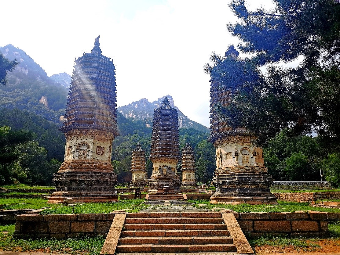 7日下午,实践队驱车前往银山塔林。银山自唐代已是寺院聚集之处,金代始建延寿寺,明代重建,称法华禅寺。塔林建于金代至清代年间,明代以后,银山寺庙逐渐衰落,现存墓塔十八座。实践队重点参观了位于法华寺遗址中的七座墓塔,其中五座为金代墓塔,两座为元代墓塔。五座金代密檐式墓塔呈梅花状排列,两座元代分别位于遗址东部与西南部。实践队围绕遗址考察,讨论墓塔上所刻浮雕与屋檐建制,释读遗址周边散落的碑刻,根据地基遗存探讨明代法华寺的大概样貌。