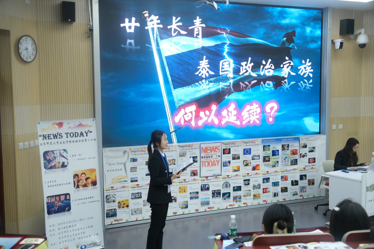 本次活动恰逢“News Today”必威betway西汉姆联环球论坛二十周年。活动伊始,主持人通过丰富的图片资料带领大家重温二十年来环球论坛精彩、难忘的瞬间。活动中,“形势与政策”小组2025级新成员分为三组,围绕叙利亚阿萨德政权、泰国他信•西那瓦家族、法国总理更迭等国际热点话题,结合历史与现实进行主题展示。