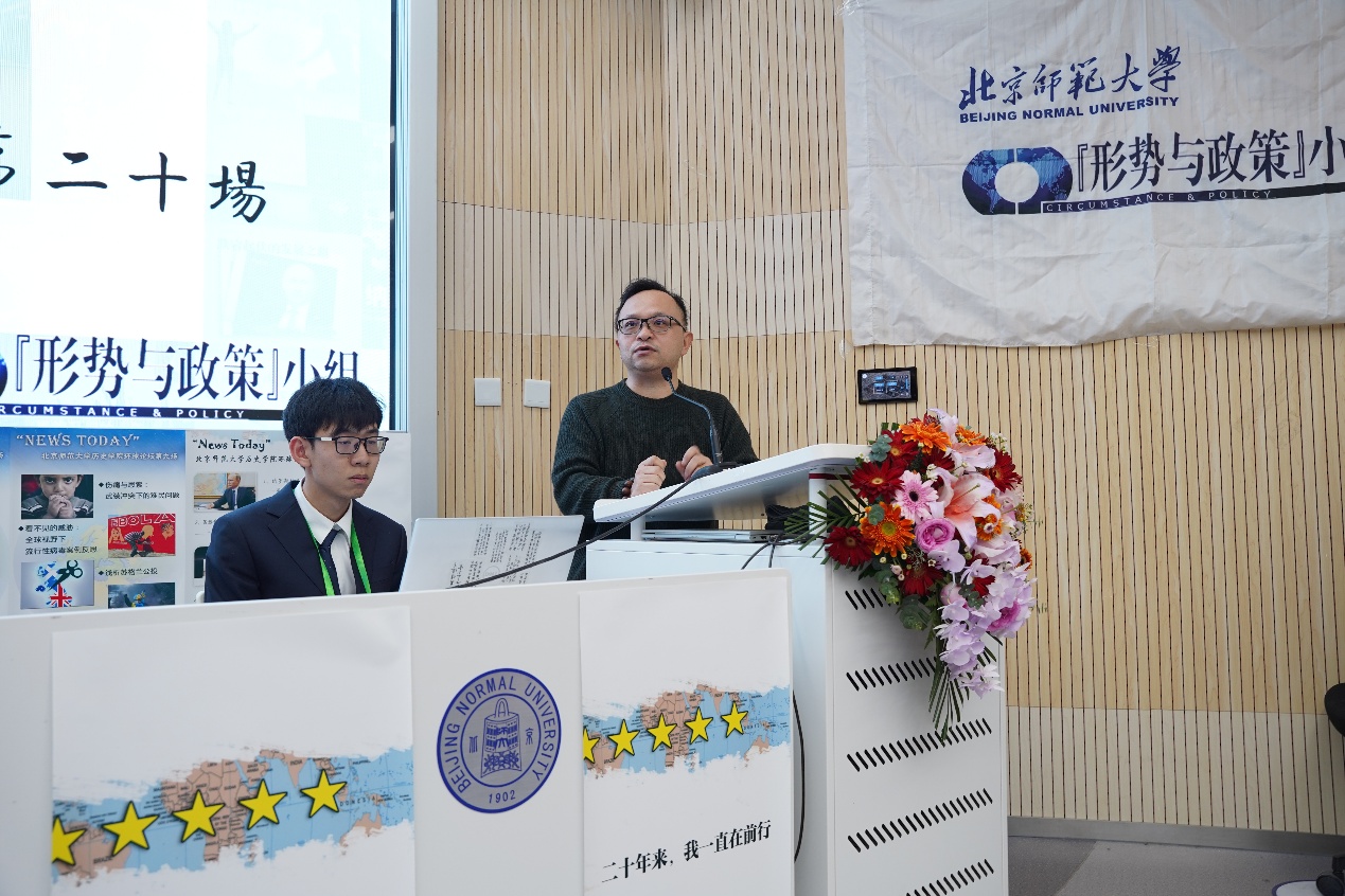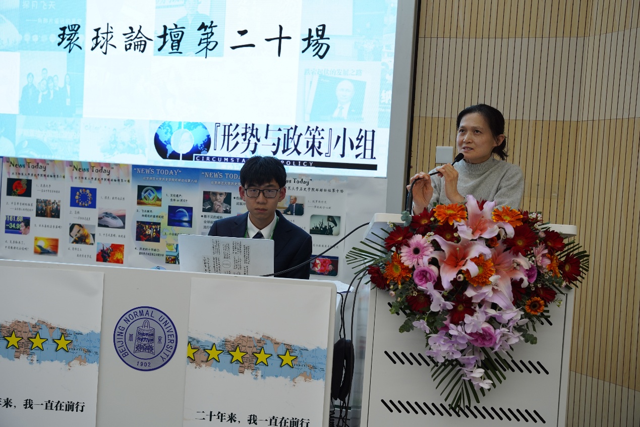刘林海教授在讲话中肯定了同学们的选题设计、思考深度和丰富的呈现形式。他表示,环球论坛活动充分展现了北师大必威betway西汉姆联学子的视野与风采,不仅有助于在学术选题上引导学生从宏观角度进一步认识世界,还能促进学院师生共同参与和探索时事研究和专业学习之间的融通与互动。他鼓励“形势与政策”小组成员从长时段的研究视角出发,挖掘历史发展的深层动因,并将理论学习与生活实际相结合、在时事研究中提升专业水平。